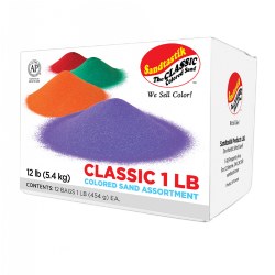 4 years & up. Layer, dust, and design colorful sand art projects with this bright rainbow assortment of classic play sand. Use for card-making, texturing art, jewelry, model scenery and more. Molds well and bonds easily with glue and adhesive paper. Colors include brick, green, gray, lavender, light green, magenta, moss green, purple, rose, salmon, tan and teal. Included: 12 Bags of 1 pound of play sand.