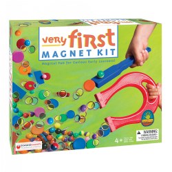 4 years & up. Your little scientist will cling to the Very First Magnetic Kit! Kids will explore the power of magnetism by comparing magnetic versus non-magnetic objects. Play magnet games and discover if a magnetic force can travel through water, cardboard, or sides of a glass jar. Includes: Magnetic wand, Giant horseshoe magnet, 2 Plastic-encased block magnet, 3 Ceramic ring magnets, 20 Metal-rimmed counting chips, 10 Magnet marbles, and an Activity booklet.