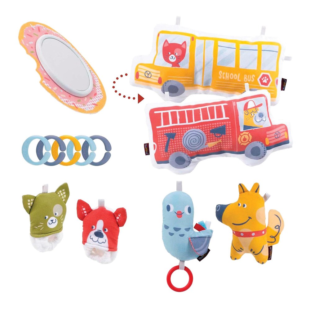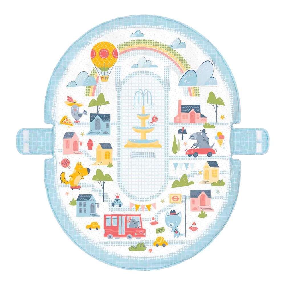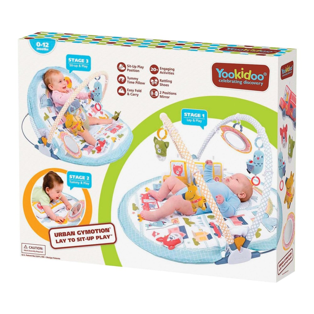 Birth & up. Little ones can graduate from a play gym to a soft, secure and supportive seat for upright sitting and playing with the Gymotion. This three stage padded play gym transforms into a supportive, upright, portable seat. Stages include Lay & Play, Tummy & Play, and Sit-Up & Play. The Gymotion features more than 20 developmental activities and plenty toys to move around. Play mat is machine washable. Batteries included. Included: 1 Smart-structure with 4 arches & auto-locking safety locks, 1 Large animal friends themed circular play mat, 1 Multi-textured battery-operated motion activated music and sounds plane, 1 Large mirror for hanging on arch or standing on mat, 1 Flower rattle with shaking beads and reflective background, 1 Multi-textured dog rattle with sliding rings and teething handle, 5 Colorful Yookidoo™ Fun Links, 1 Safety seat for attaching in Stage 3, 1 Buckle strap for attaching in Stage 3, and 1 Tummy Time Pillow.