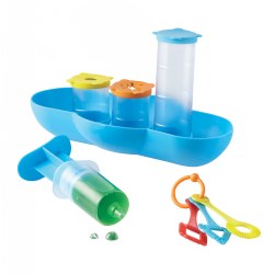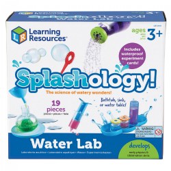 3 years & up. Discover the wonders of water! This 19-piece Splashology! Water Lab features waves of water-ready activities that introduce aspiring scientists to the concepts of volume, buoyancy, flow, and more with every splish and splash. Kids can dive into seven splash-filled experiments or explore all of the splashes and bubbles of each piece with parental supervision. Ride the waves with the Floaty Boat tray, squirt streams of water with the Splash Syringe, or turn your sink into homemade bubbles kit with the lab's three bubble wands. Designed for the bathtub, sink, or water table, this engaging science kit supports guided and open-ended STEM-based play. Lab pieces are made from durable plastic and foam that can be easily cleaned. Included: Floaters, Flasks, Hands-On Tools, and Waterproof Experiment Cards.