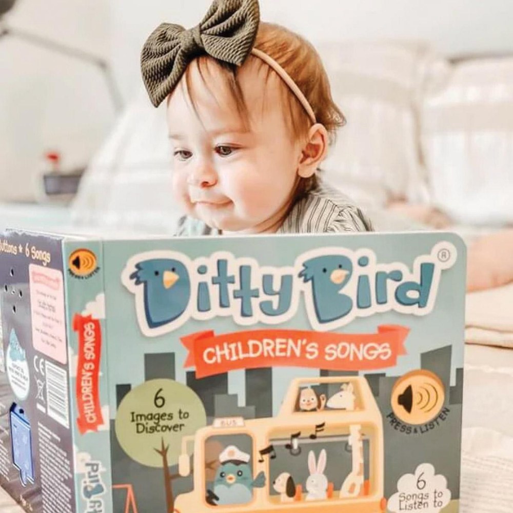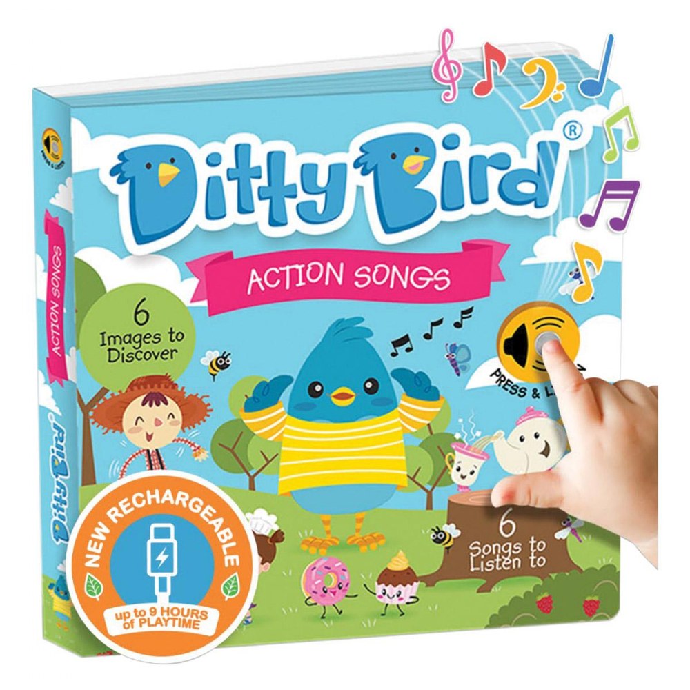 12 months & up. Make learning delightful with this set of two interactive musical books! Join Ditty Bird on musical adventures featuring six classic children's songs and six lively action tunes that inspire movement, learning, and giggles. With engaging sound buttons and vibrant illustrations, little ones can explore animals, letters, and body parts while building early vocabulary, imagination, and motor skills. Songs include The Wheels on the Bus, Five Little Ducks, Head, Shoulders, Knees & Toes, B-I-N-G-O, Simon Says, Pat-a-Cake, I'm a Little Teapot, and more. This set includes two musical books with upgraded volume control, enhanced speaker quality, and a fast, rechargeable USB-C battery that provides up to 9 hours of playtime. Please note: These books charge via USB-C; cable not included.