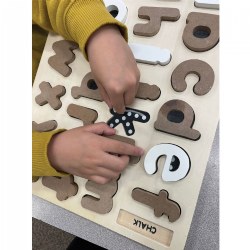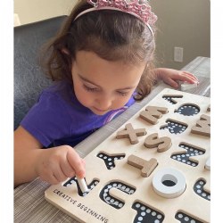 3 years & up. Encourage children to practice early handwriting and number formation, while reinforcing letter and number recognition, with these Chalkboard-Based Alphabet & Number Puzzles! Each puzzle consists of a chalkboard base with tracers and indented spaces, allowing the child to practice printing letters or numbers without "going out of the lines." Use the indented spaces to trace the shapes of the letters or numbers with their fingers, or use a piece of chalk to print, erase, and practice again and again! Puzzles are manufactured with high-quality sealed wood and non-toxic paint in neutral colors. Chalk not included. Each puzzle measures 16" x 12" x 2".