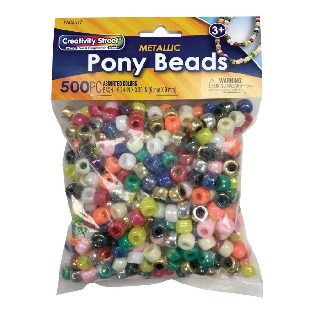 3 years & up. Pony beads are a great option for use in making necklaces, bracelets, key chains and much more. Pony beads can be used in educational activities where children sort them by color, shape, or size. They can also be used for counting exercises, helping to develop math skills and hand-eye coordination. All pony beads are 6 mm x 9mm, in assorted metallic colors. Includes 1,500 pony beads.