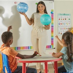 Grades K - 6. This inflatable classroom set helps children understand the size and distance relationships of the solar system, while learning about rotation, revolution and orbit through class activities or demonstrations. Includes 23" Sun and proportionate planets and moon with sizes ranging from 5" to 14". Also includes a foot pump, hooks for hanging, and teacher's activity guide. Deflates for easy storage.