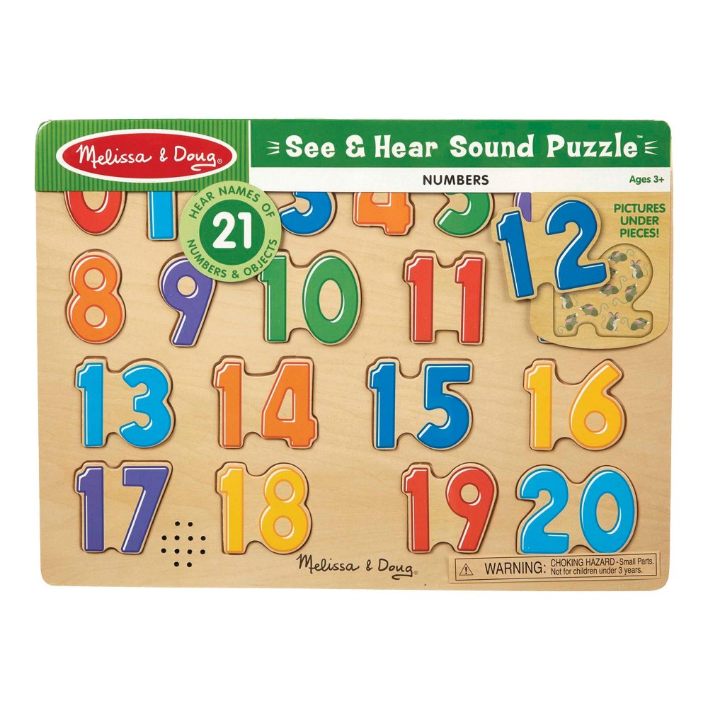 3 years & up. This 21-piece wooden sound puzzle pronounces the name of each number when its piece is placed correctly! Pieces are slightly raised above the puzzle board for easy grasping. Colorful pictures underneath each piece help teach counting and reinforce the relationship between quantities and numerals. This educational puzzle has lots of ways to learn and play! Requires 3 AAA batteries (not included).
