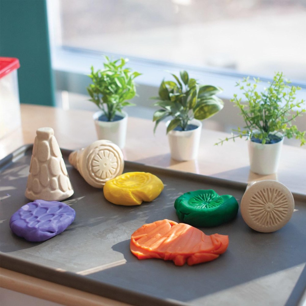2 years & up. This non-toxic dough is soft and pliable, yet never sticky, making it perfect for molding, stamping, and rolling. Squishing, pinching, and molding the dough helps strengthen little hands and fingers, preparing them for skills like writing and buttoning. Each 1.98 lb tub contains six individually wrapped tubes of dough in one of the following colors: orange, green, blue, purple, red, or yellow, all stored in a reusable container with a lid.