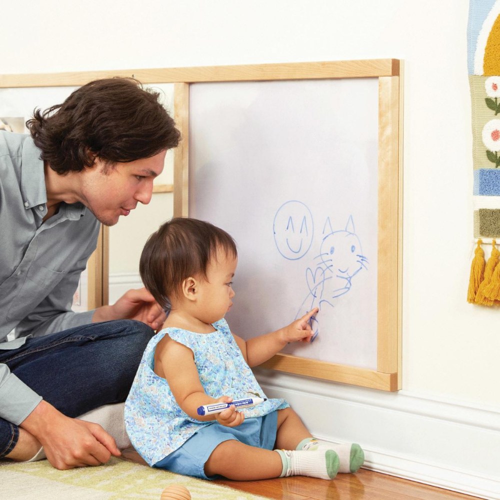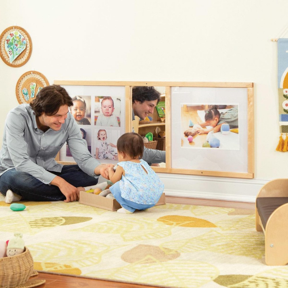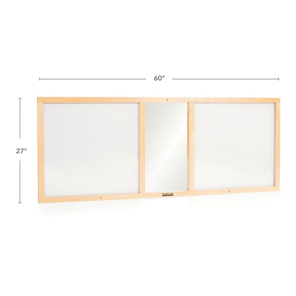 12 months & up. Mirrors are important tools that foster a young child's self-awareness, self-esteem, intellectual curiosity, and cognitive development. The Activity Mirror Display Center offers a captivating experience for young children, inviting them to explore their reflections and engage with images on the surrounding panels. Each plexiglass panel can be used as a write-on/wipe-off board, or used to hold images of children, drawings, and more. The visual stimulation provided by images on the panels at the same time as their reflection in the mirror promotes development as children identify objects, colors, shapes, facial expressions, and more. Features a shatter-resistant acrylic mirror and a birch plywood frame. Entire unit measures 60"W x 27"H x 1.25"D