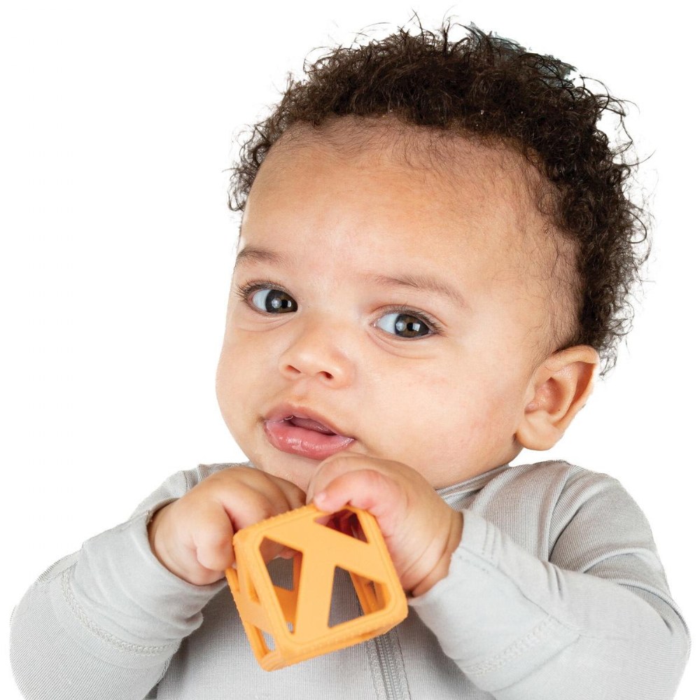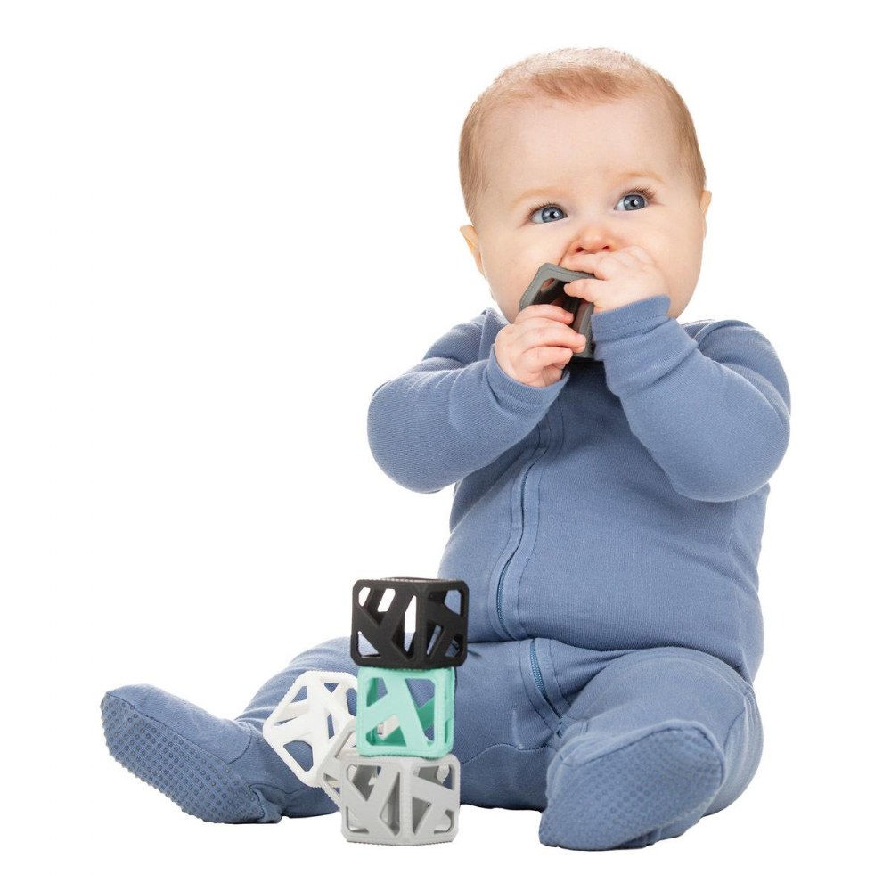 3 months & up. The Stack N Chew™ Mini Cubes are the perfect developmental teething toy, designed to engage babies through stacking, squeezing, and chewing. Made from BPA-free, food-grade silicone, these cubes are safe for baby's tender gums, providing gentle relief during teething. Their flexible holes help strengthen gripping skills, while the contrasting modern colors stimulate hand-eye coordination and promote motor skill development through stacking and carrying. Lightweight and easy to travel with, these cubes encourage imaginative play. Featuring textured edges for chewing, an easy-grip design, and stackable construction, they offer both fun and functionality for growing little hands. Dishwasher and dish soap safe. Do not microwave. Monitor for wear and tear and discontinue use if damaged.