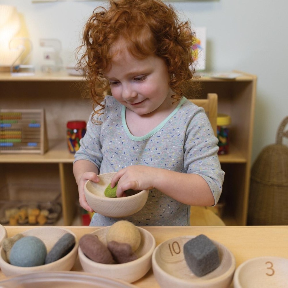 10 months & up. These beautifully crafted natural bowls are designed to enhance number work, providing an engaging and tactile way for young children to develop their counting skills. Thoughtfully made, they ensure that numbers remain visible at all times, allowing children to easily track their progress and self-check their work. With their inviting design and practical functionality, these eco-friendly bowls encourage independent learning and hands-on exploration of numerical concepts. 4.7"D.