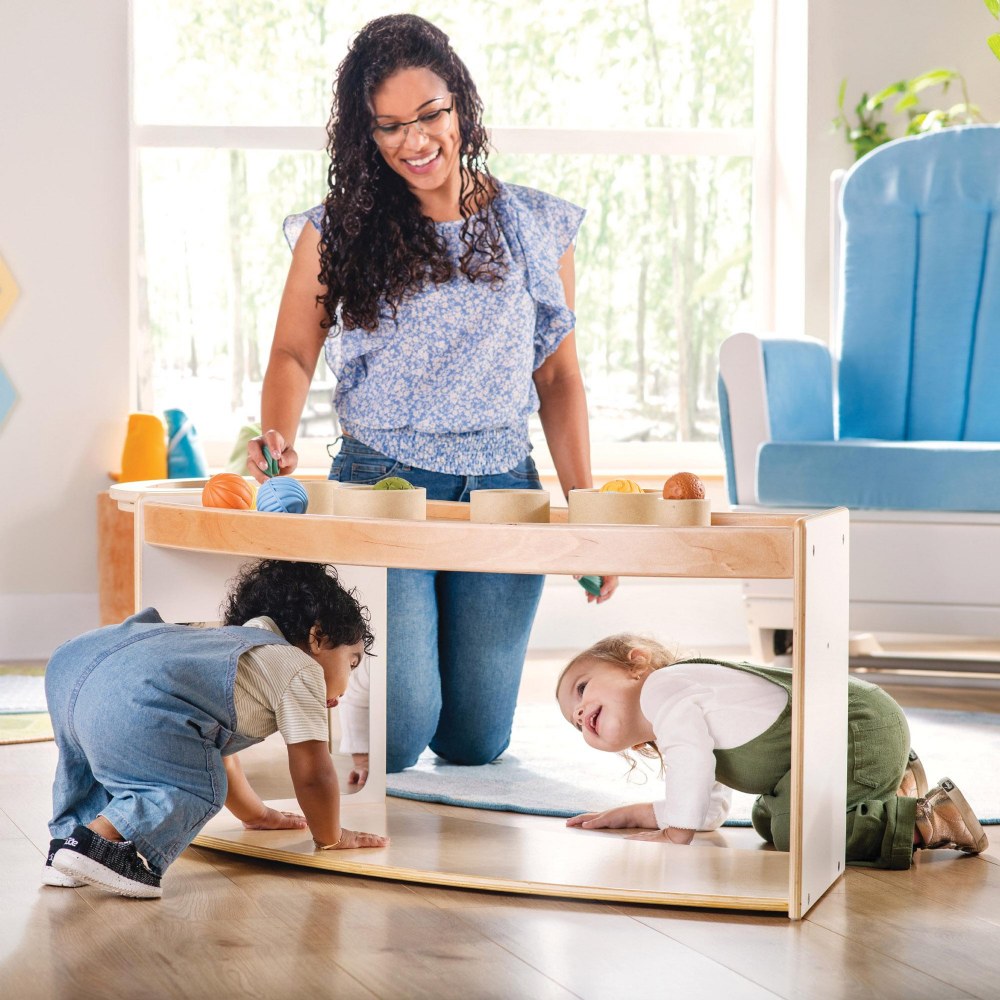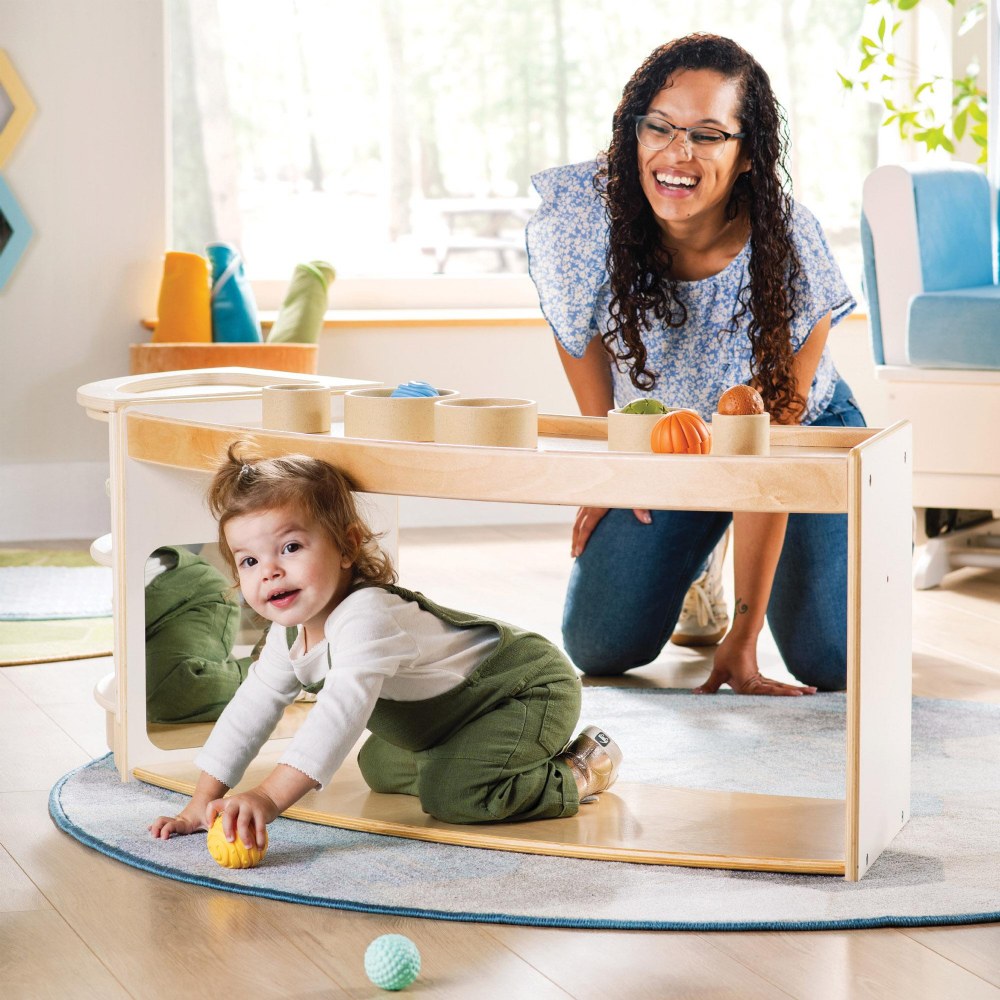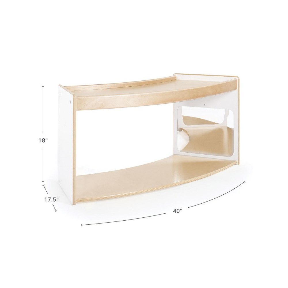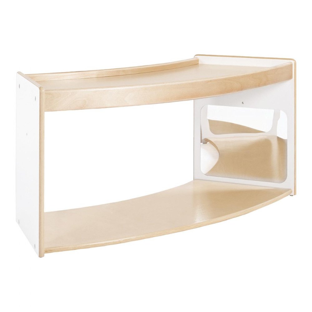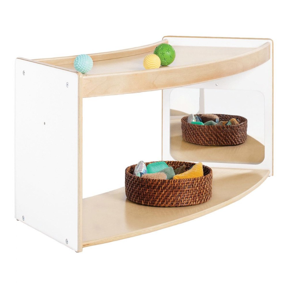 1 - 3 years. Encourage young children to move, play and explore with functional, multi-purpose furniture that is designed with their play patterns in mind. The Sense of Place Crawl Through Storage is a unique storage solution that encourages children's physical and cognitive development. The curved shape divides the classroom using nature-inspired geometry, while the playful open shelf acts as a playful transition between zones. Shatter-resistant mirrors on opposite inner walls encourage self-awareness, interaction and connection for crawlers, while the raised edge of the top shelf encourages those just learning to walk to pull up. Create a modular system with multiple units or other pieces from the Sense of Place for Wee Ones Collection using durable hardware. Made from a durable blend of white laminated plywood and solid birch, this unit will stand up to the rigorous nature of early childhood environments. Measures 40"W x 18"H x 17.5"D.