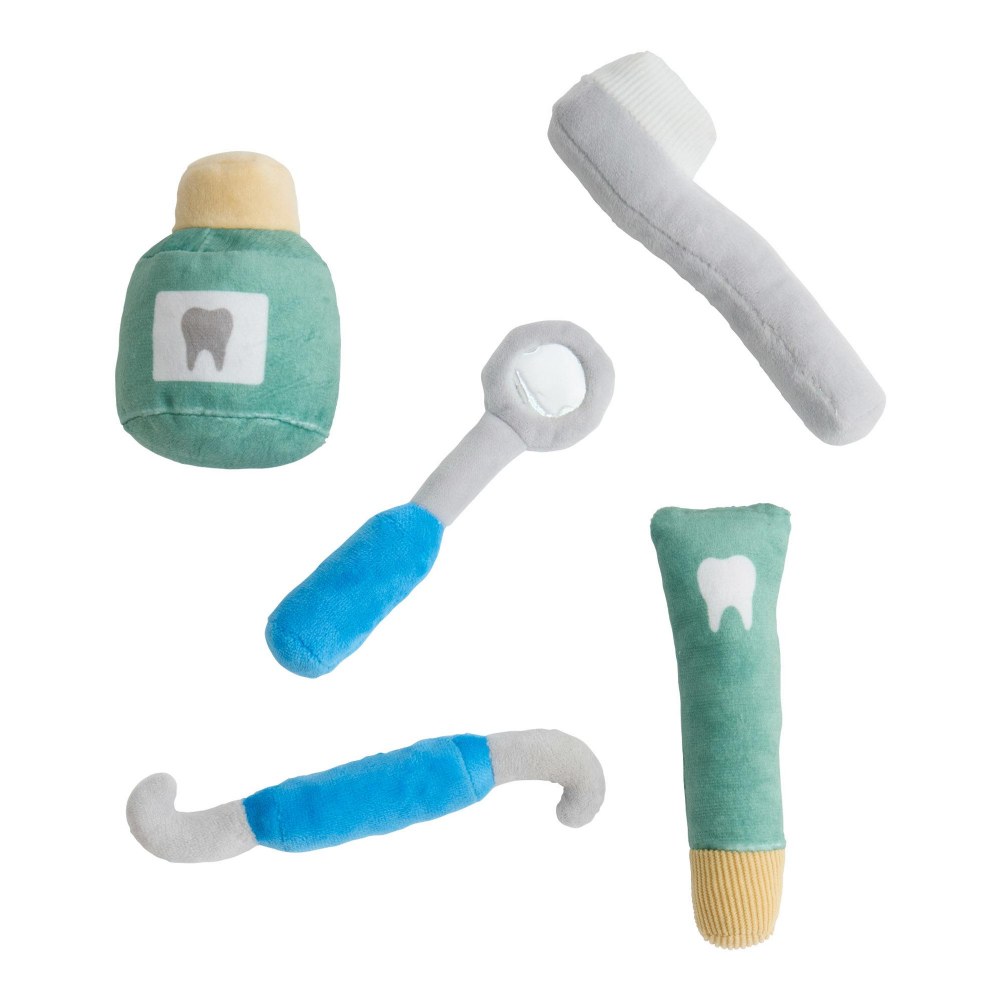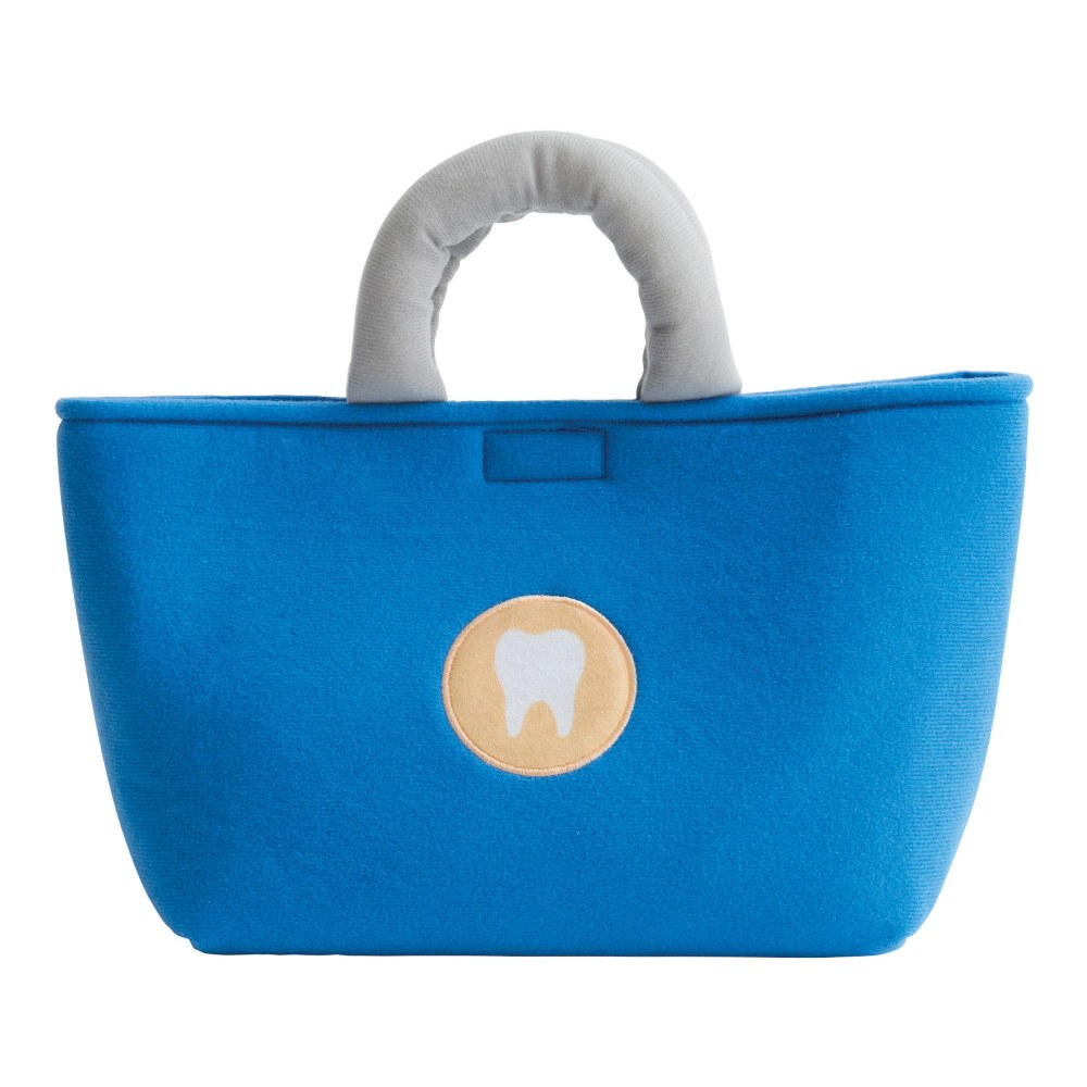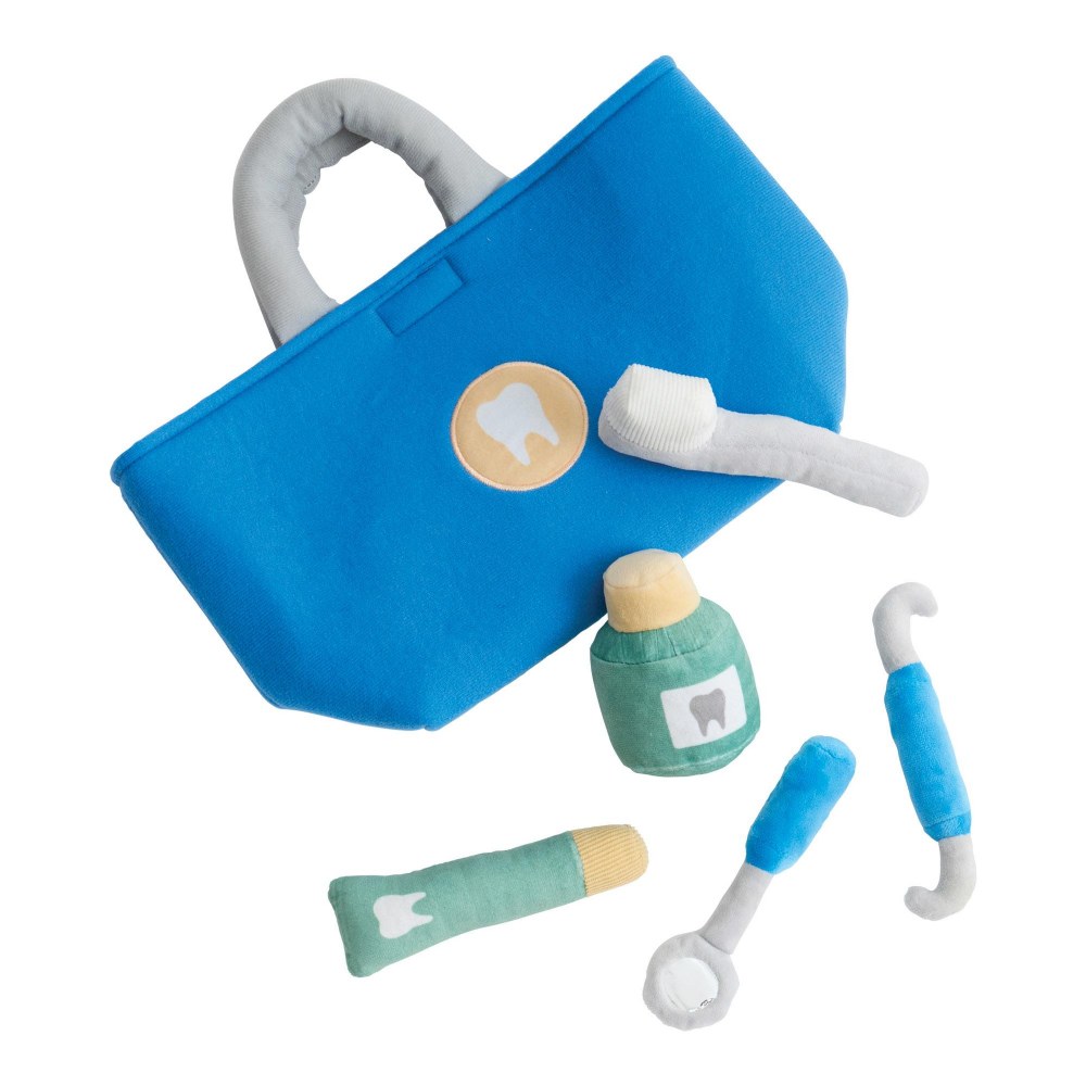 18 months & up. Encourage healthy habits, awareness of oral hygiene, and dental role play with this plush dentist kit. Store the machine washable, fabric pieces in the convenient carrying bag for easy organization and movement around the classroom. Set includes plush toothbrush, dental mirror, toothpaste tube, floss, mouth wash, and carrying bag.