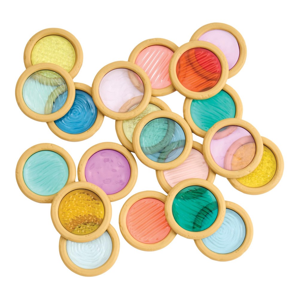 18 months & up. When provided with rich, beautiful materials, the possibilities for discovery are multiplied. This set of translucent discs encourages children's relationships with nature through organic patterns and colors. Durable enough for continued use indoors or outdoors, this 20-piece set interacts beautifully with natural light or light tables, and is the perfect addition to loose parts play. Children can work on patterning, color recognition, and seriation as well as engage in tactile exploration. Each disc measures 2.8" in diameter.