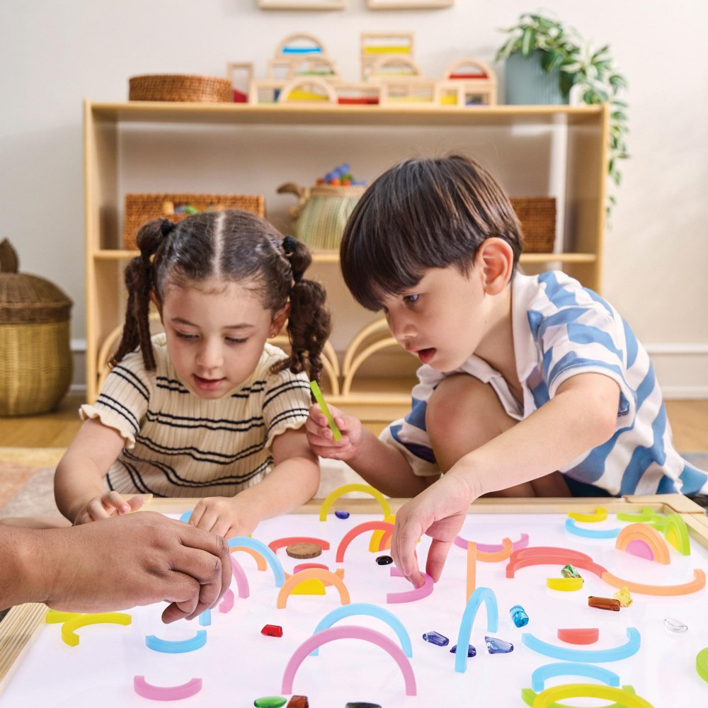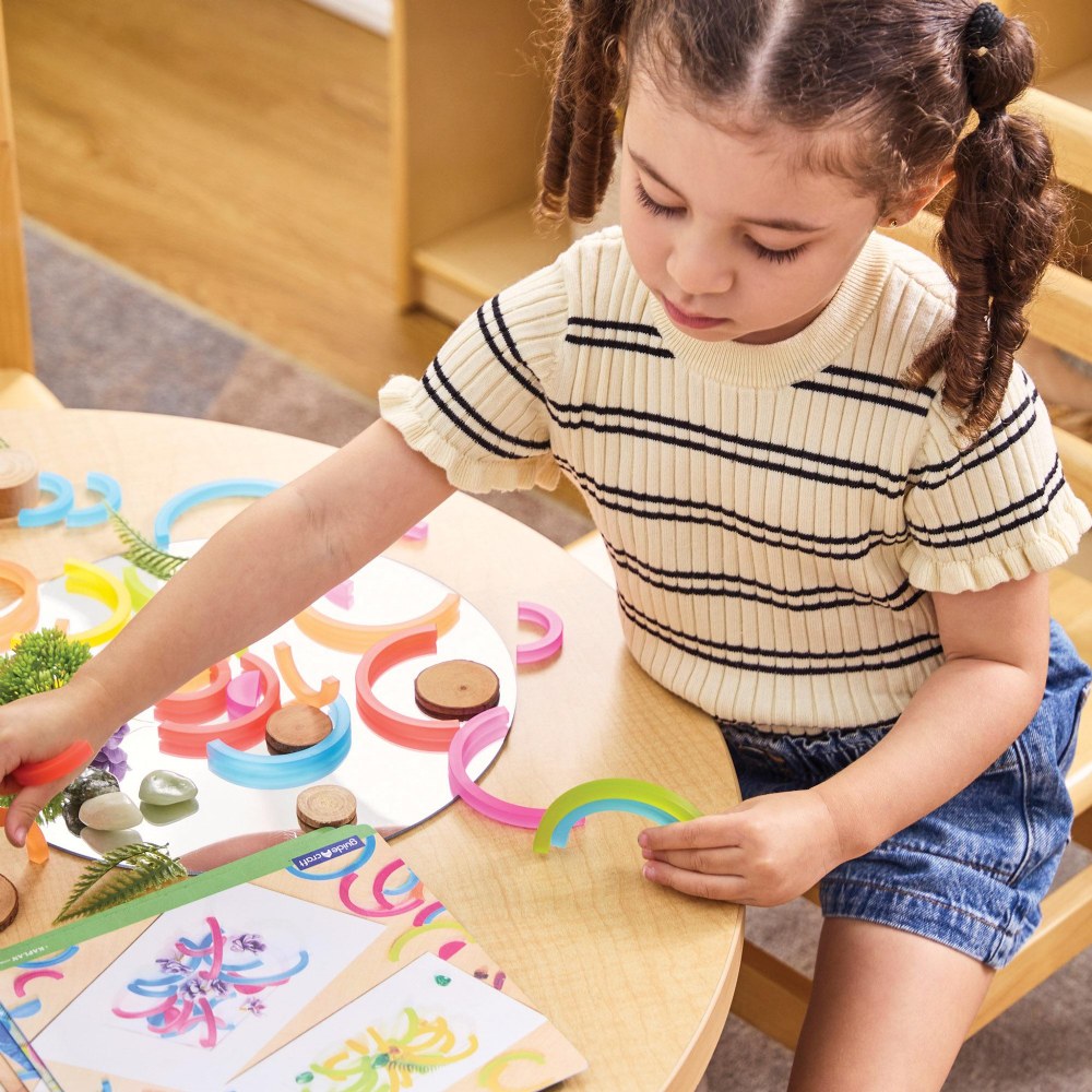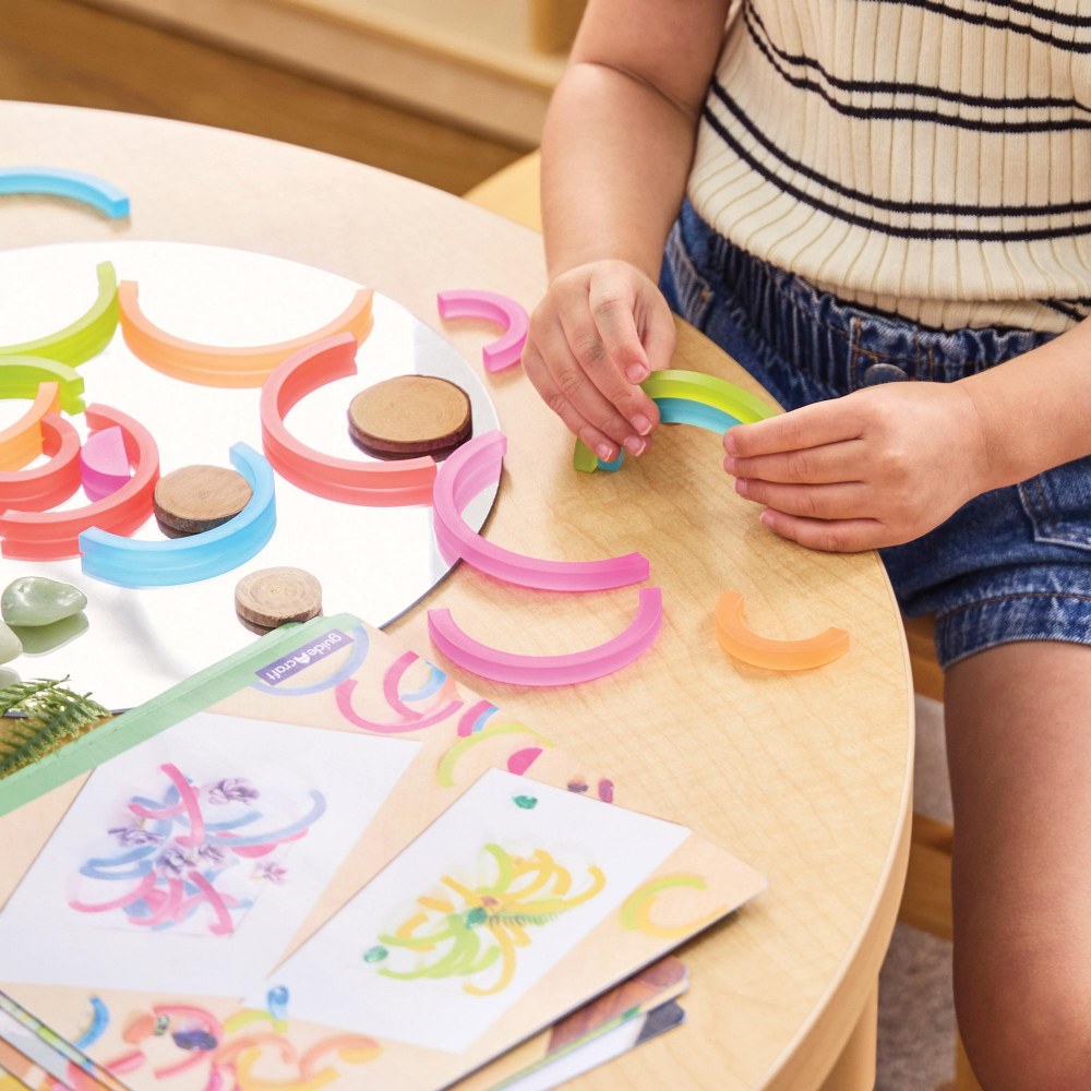 3 years & up. Enhance open-ended building play, loose parts play, light play and more with this durable, versatile set of colorful arches. This 90-piece set features vibrant colors and concentric arch pieces that work together beautifully to create organic shapes and patterns. Curved shapes encourage children to explore relationships in balance and organic geometry. Double-sided build cards included to inspire 2D and 3D builds and deeper play experiences. Largest piece measures 3.5"L x 1.8"W x .3"H. Smallest piece measures 1.2"L x .6"W x .3"H.