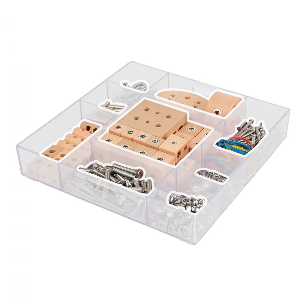3 years and up. The possibilities of discovery are multiplied when rich variables are at children's fingertips. Expand your collection of loose parts with a complete replacement kit of the components included in the Random Robots Loose Parts STEM Kit. The Random Robots Loose Parts STEM Kit is a laboratory of opportunity uniquely designed to inspire children to experiment, explore, construct and deconstruct. Children can combine the kit's authentic building materials including Poly+ blocks, rubber bands and a variety of nuts, bolts and hardware to create robot-inspired characters, boats, towers, and endless imaginative creations. Fine motor skills, dexterity, strength and process-focused play are prioritized during hands-on activities. Replacement Kit does not include storage tray.