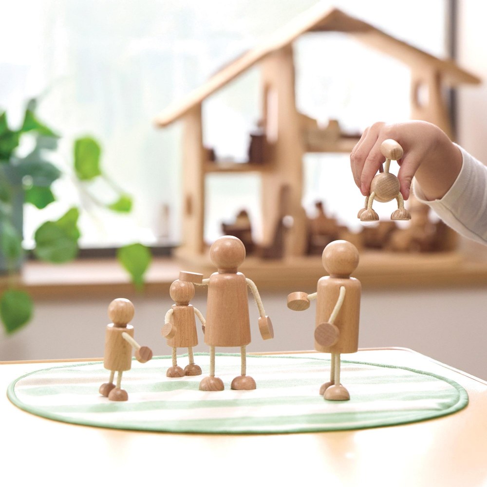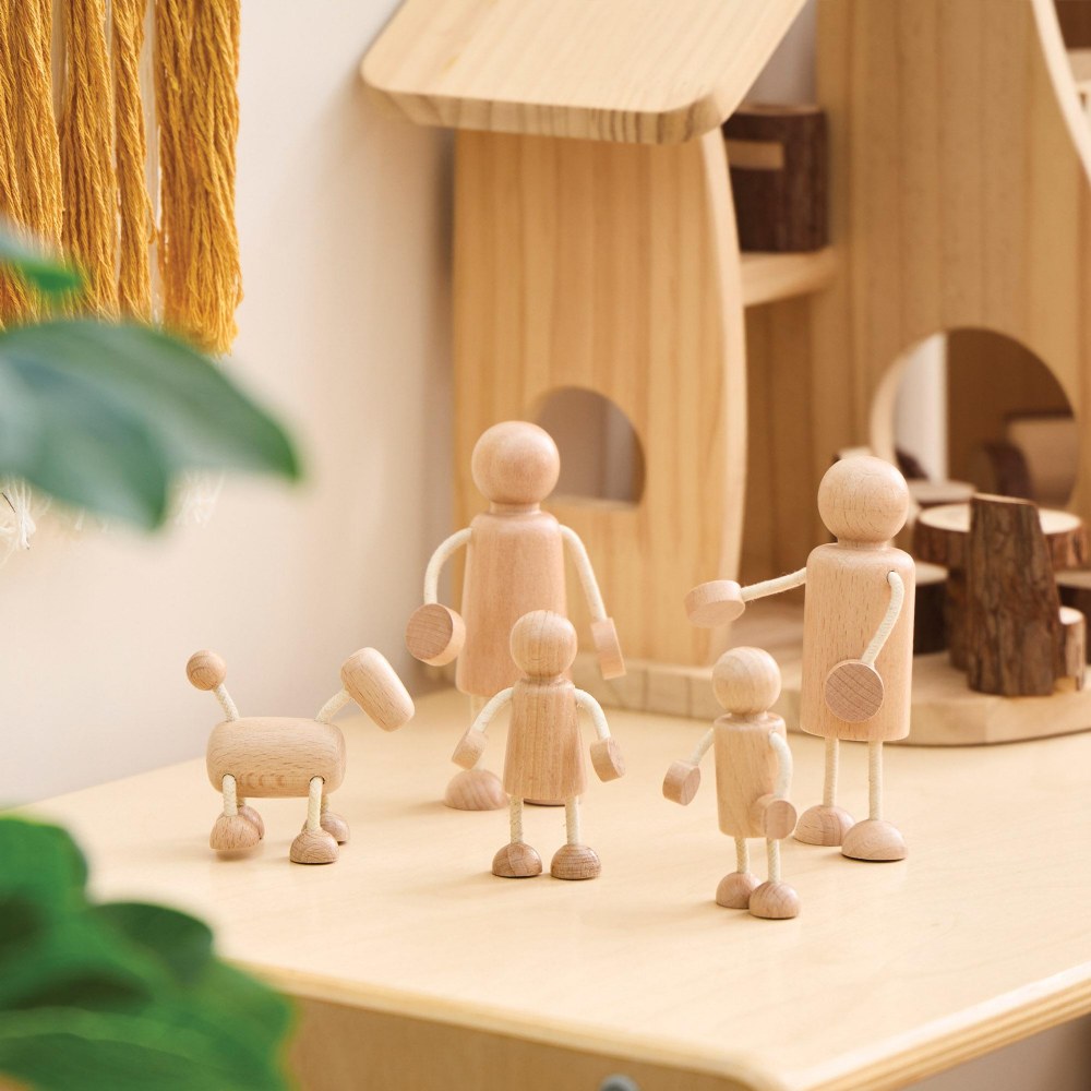 3 years & up. Bring play to life with a set of wooden play people and pets. Complete with figurines to represent a family of 4 and their pet dog, the Wooden Family Playset is the perfect addition to dollhouses and pretend play zones. Rounded edges and a natural wooden color provide a beautiful, subtle way for children to engage in play. Set includes two adult-sized figures, two child-sized figures and one dog.