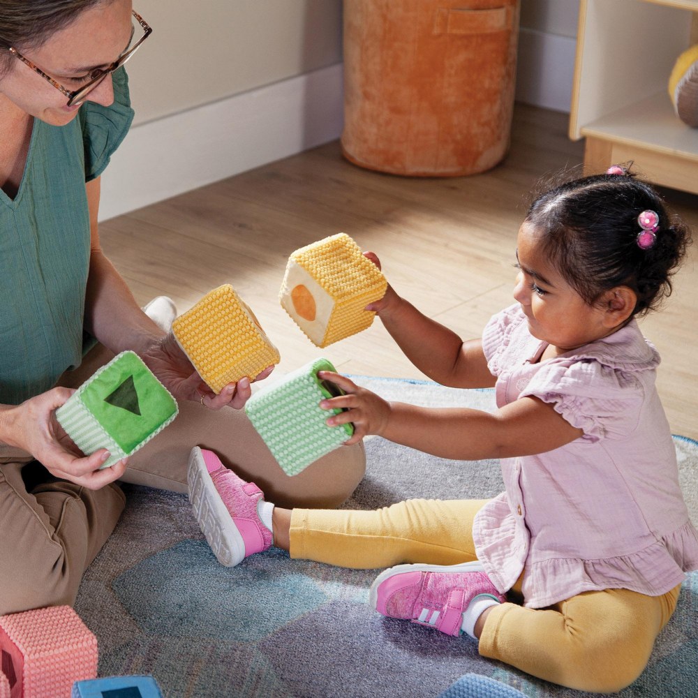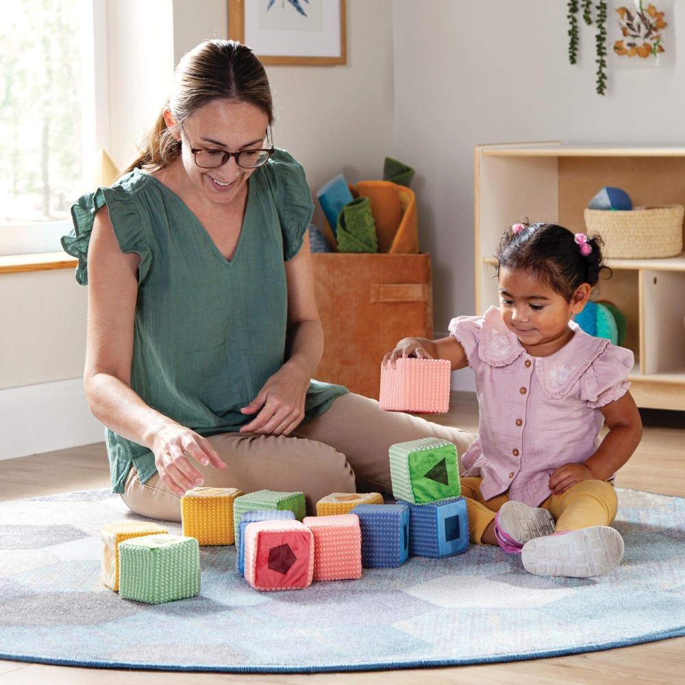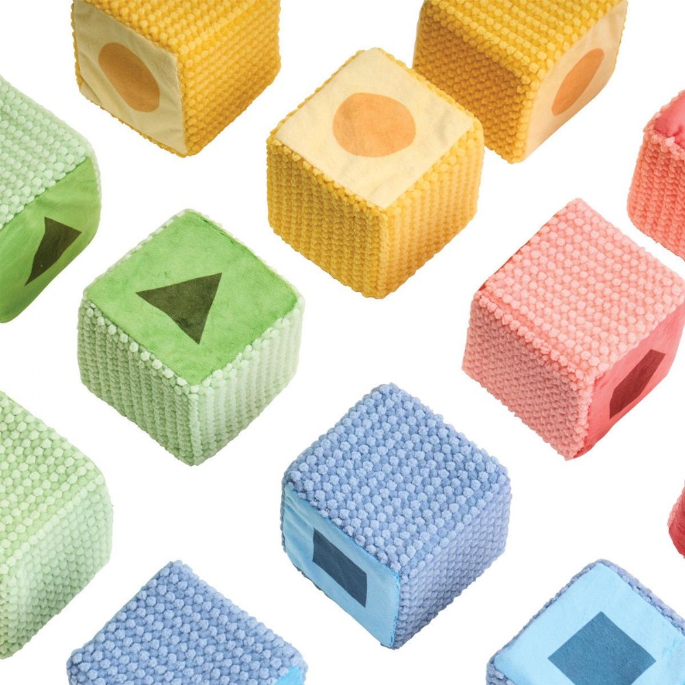 6 months and up. Every side of these soft fabric blocks features another way for children to learn through play. Young children can practice fine motor skills and color and shape recognition while stacking and sorting the pieces of this block set. Textured sides enhance sensory-based play and opportunities for tactile exploration. Set includes 12 lightweight blocks; 3 red, 3 green, 3 blue and 3 yellow. Each block measures 3"L x 3"W x 3"H.