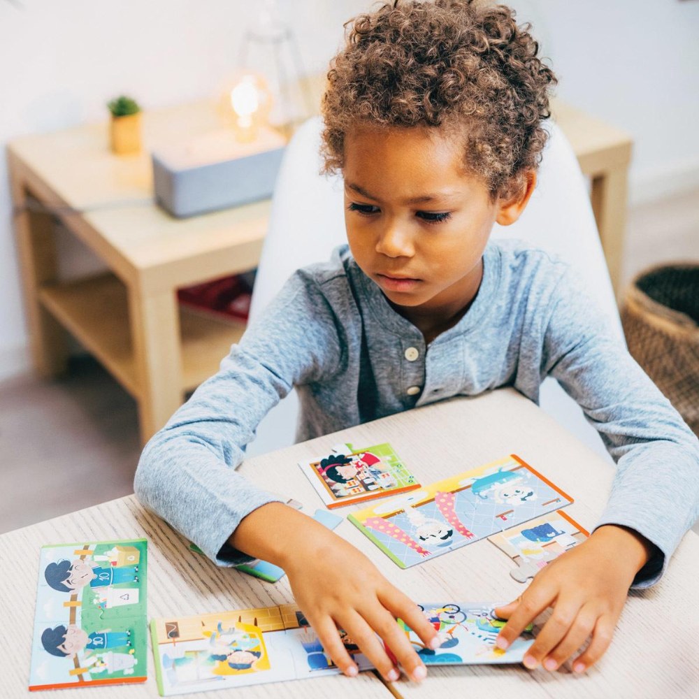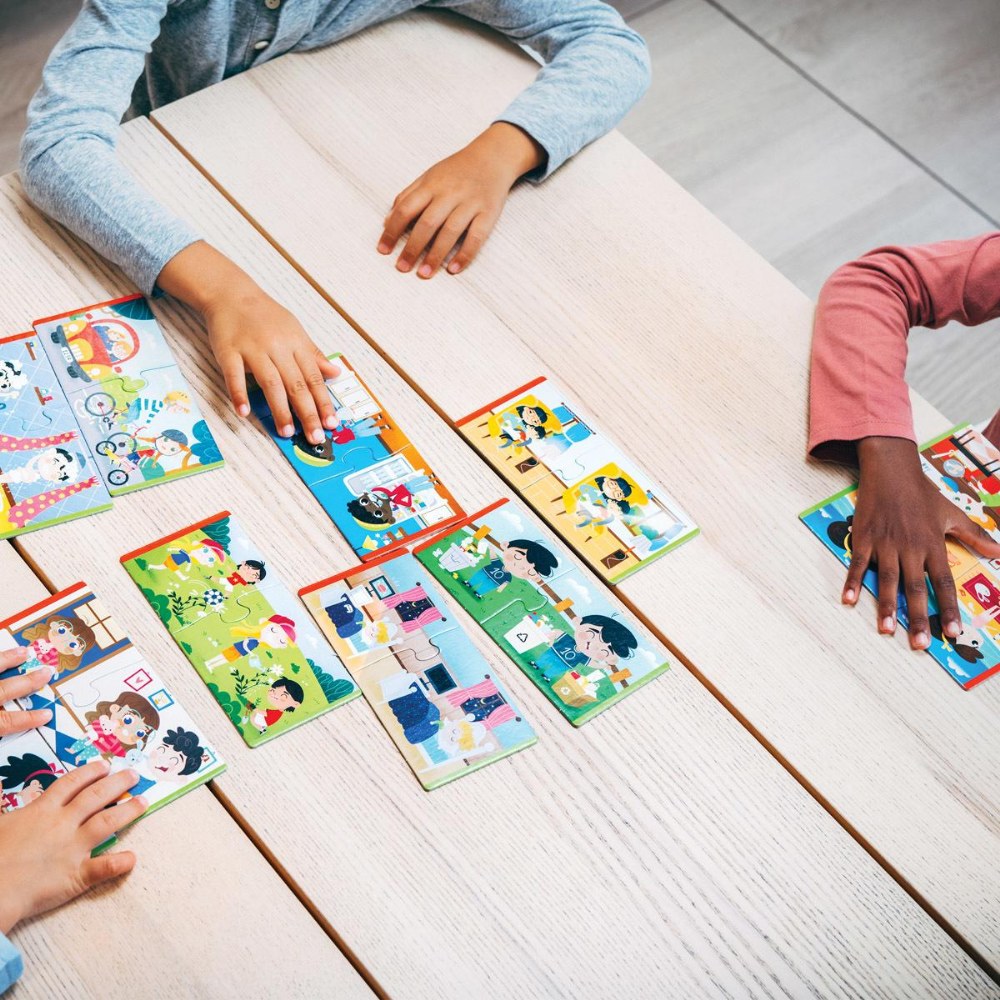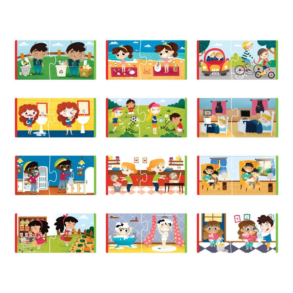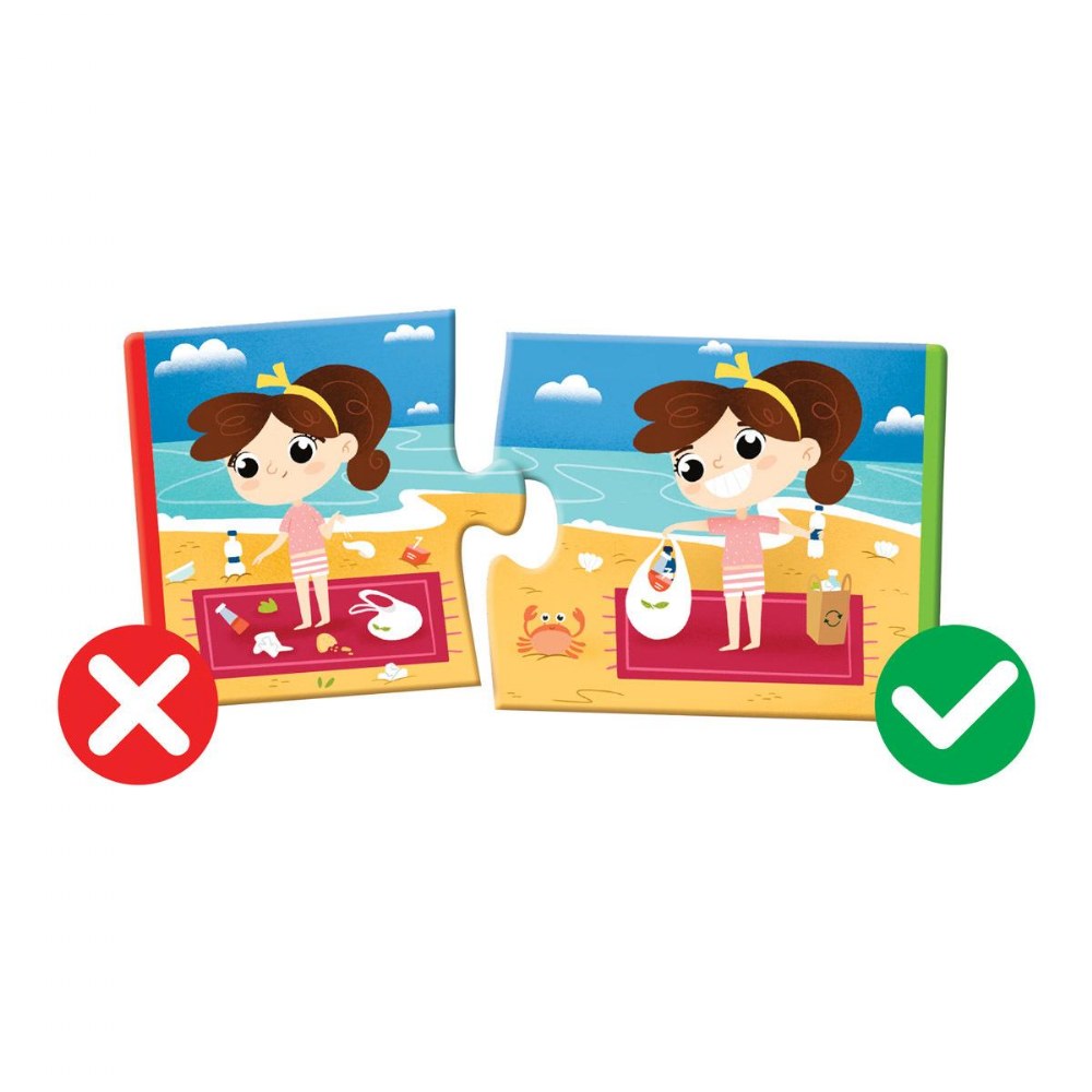 2 years & up. Recycle, use your bicycle, and eat organic. By changing their everyday actions, children can be environmental champions! While building 12 mini puzzles, children will have fun learning about little changes they can make in their daily lives to help their natural environment. On the red edged pieces, a group of diverse kids show common habits, but on the green edged pieces, they show habits to protect the earth!