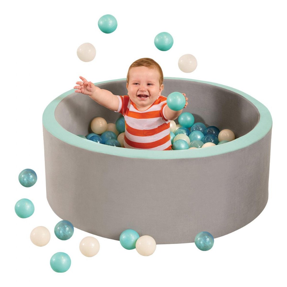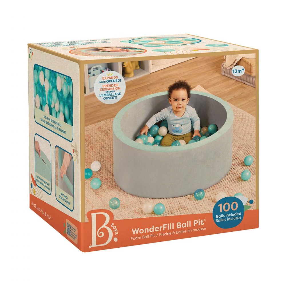 12 months & up. Fill it up and hop right into the WonderFill Ball Pit. This foam ball pit expands when opened and comes with 100 crush-resistant balls. Pick a spot in any room and simply fill with the bubbly balls and hop in to get playtime started! Its squishy foam design gives kiddos a plush play space to develop gross motor skills and get the wiggles out when they're indoors. Get ready for big ball pit fun and a tubful of giggles!