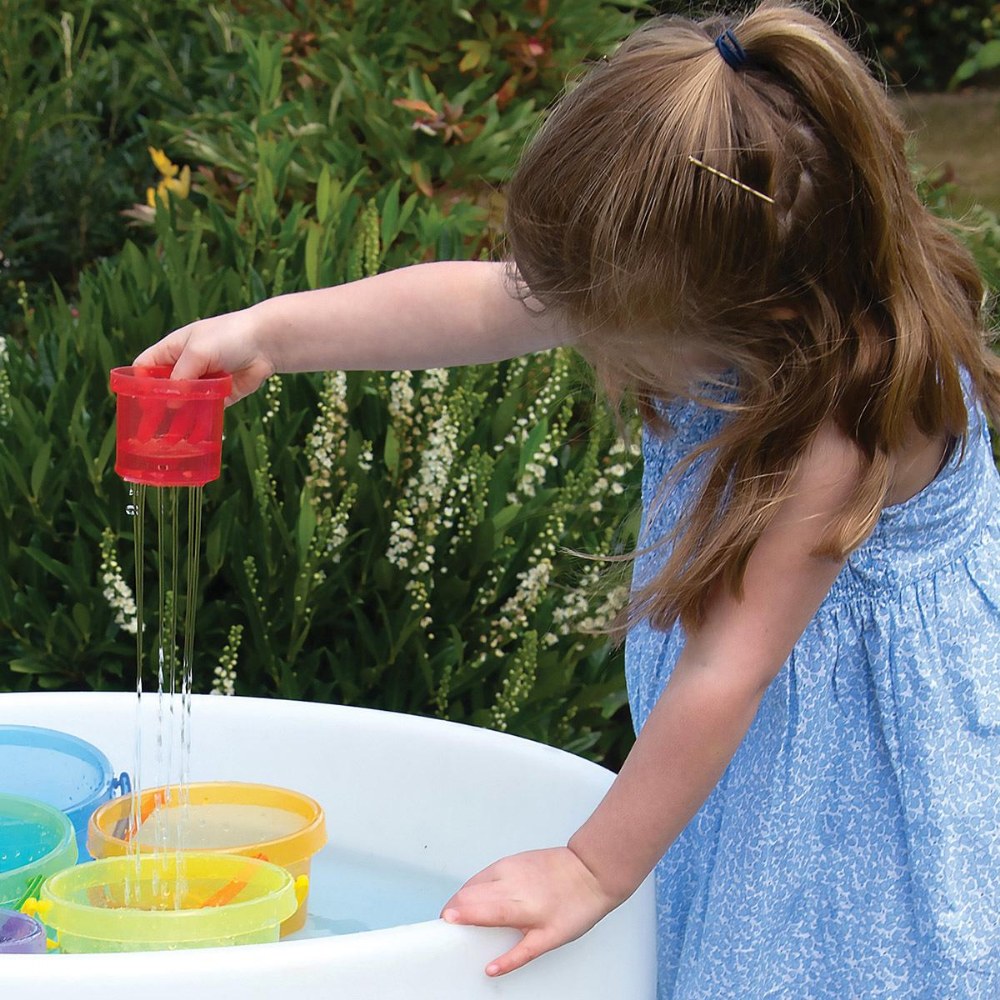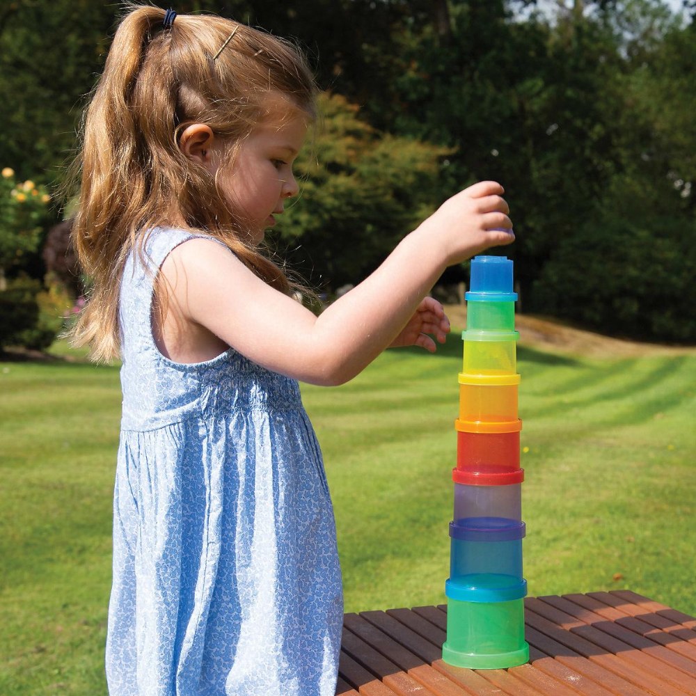 12 months & up. Toddlers can stack the cups up high while exploring size, color, shape, and spatial relationships. Perfect for hands-on learning, these versatile cups support manipulative play, tactile exploration, and hand-eye coordination. The set includes 9 colorful translucent cups, each with an embossed shape on the bottom and holes for water play. Easy to clean and dishwasher safe.