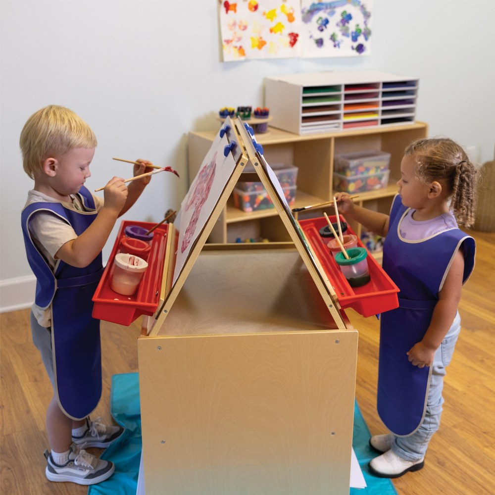 3 years & up. Keep little artists clean and confident during every messy adventure with this set of Preschool Sleeveless Aprons. These lightweight aprons give young learners the freedom to paint, pour, scoop, and explore without worrying about ruining their clothes. The sleeveless cut allows full range of motion, while the easy hook-and-loop closure makes the aprons simple for children to put on and take off, encouraging independence and self-help skills. Each apron is made from a wipe-clean material that stands up to paints, water play, and messy activities. Perfect for home, childcare centers, or classrooms, this set provides enough aprons for group play, shared art stations, or rotating activities. Aprons measure 23"L. Set of 4.