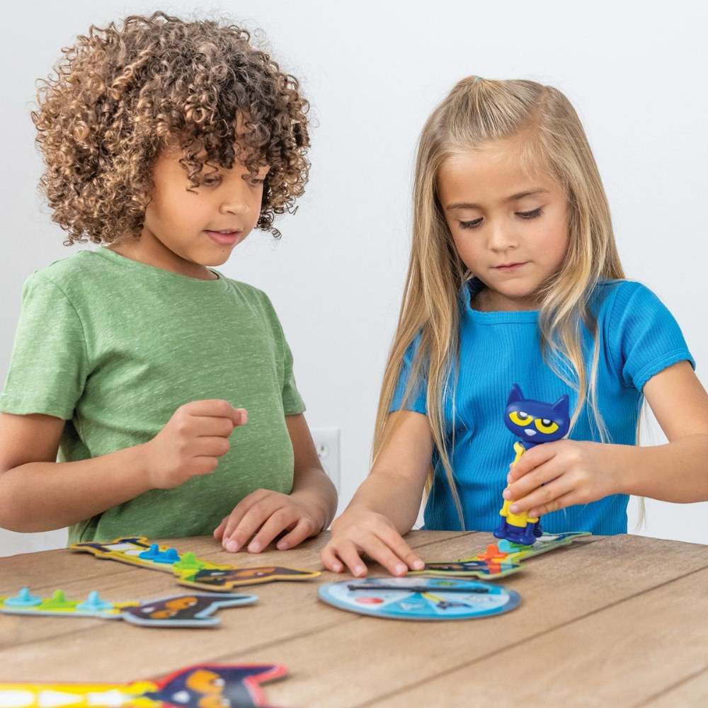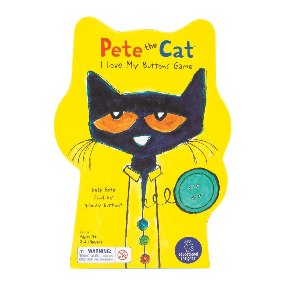 3 years & up. Pete the Cat has lost his buttons and he needs your help to get them back! In this fun and fast-paced game, players take turns spinning the spinner and using the Pete the Cat squeezer to collect matching buttons. Match the button's shape or color and place it on your Pete the Cat shirt game board. The first player to fill their shirt wins! As kids play, they'll build essential early learning skills like color recognition, shape identification, and matching-all while strengthening fine motor skills with the easy-to-use squeezer.