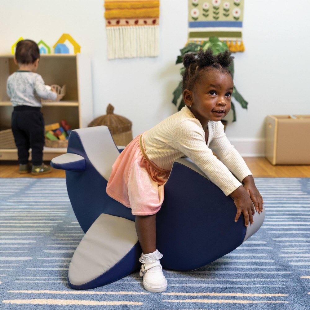 12 months & up. Soar into fun with our Rocking Airplane! Designed to spark active play, this rocker helps little ones build balance and coordination. The wide wings provide stability to prevent tipping, while the high-density foam seat offers a soft, secure ride. It's all wrapped in a durable, eco-friendly cover that is easy to wipe clean. Perfect for busy classrooms and play areas. Measures 27"L x 26"W x 16.25"H.