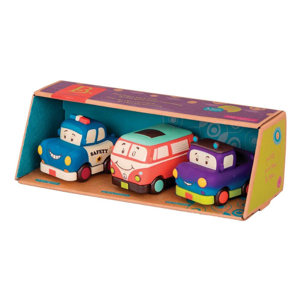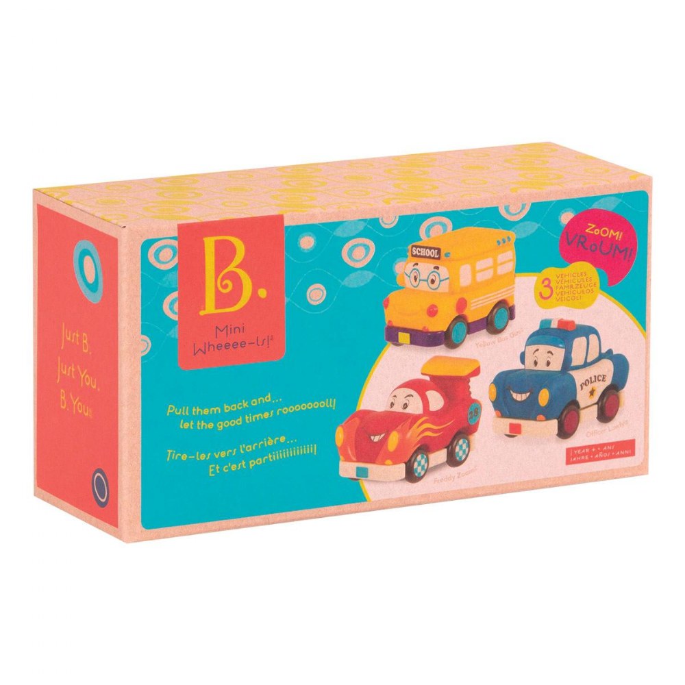 12 months & up. Meet Safety Sam, Yellow Bus Gus, Muddy Miles, Freddy Zoom, and Groovy Patootie! These playful Mini Pull Back Vehicles are full of personality and perfect for little hands. Toddlers simply pull them back and watch them zoom ahead, building fine motor skills, hand strength, and cause-and-effect understanding. Their smooth, compact design makes them easy to grip and ideal for on-the-go fun. Sets include a police car, van, truck, hot rod, and school bus. Available in sets of 3 or a set of 6.