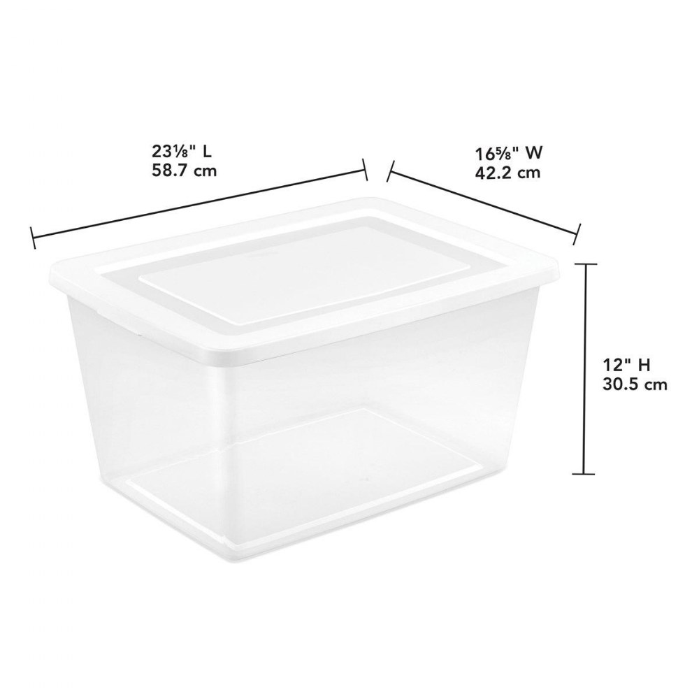 This 58 Quart/55 Liter Storage Container features a see-through base allowing contents to be easily identified. Recessed handles for easy lifting and carrying. The lid has comfortable grips and an indexed surface area for exceptional stability when stacking multiple units. Measures 23.125"L x 16.675"W x 12"H.