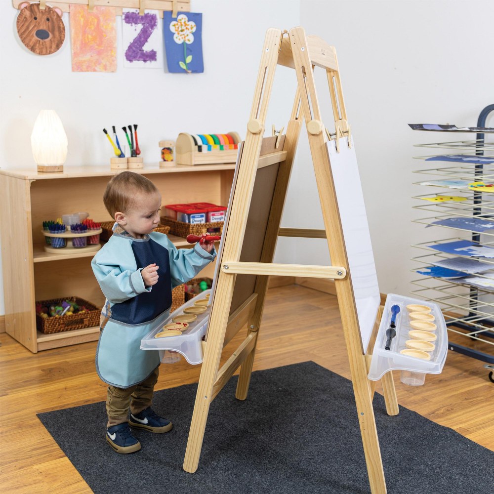 12 months & up. Let your child dive into creative fun with the Toddler Long Sleeve Art Aprons. These long-sleeve aprons offer full coverage during painting, water play, or messy activities. The aprons are easy to wipe clean with soap and water, making cleanup simple and stress-free. They secure comfortably with hook-and-loop fasteners and ties around the waist. When children wear one of these aprons, they can focus on exploring colors, textures, and art techniques with confidence, knowing they (and their clothes) are protected. This set makes it easy to outfit a classroom, art center, or home, and ensure there's always a clean apron ready for the next project. Aprons measure 17"L. Set of 4 aprons.