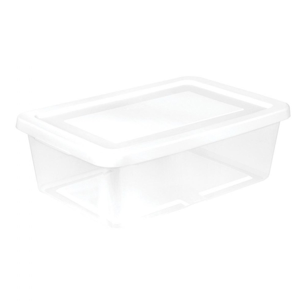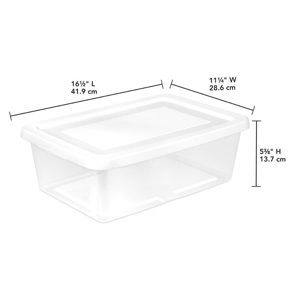 This container features a see-through base allowing contents to be easily identified. Recessed handles for easy lifting and carrying. The lid has comfortable grips and an indexed surface area for exceptional stability when stacking multiple units. Outside dimensions measure 16.5"L x 11.25"W x 5.375"H. Interior dimensions at bottom measure 13.87"L x 9.12"W x 4.75"H.