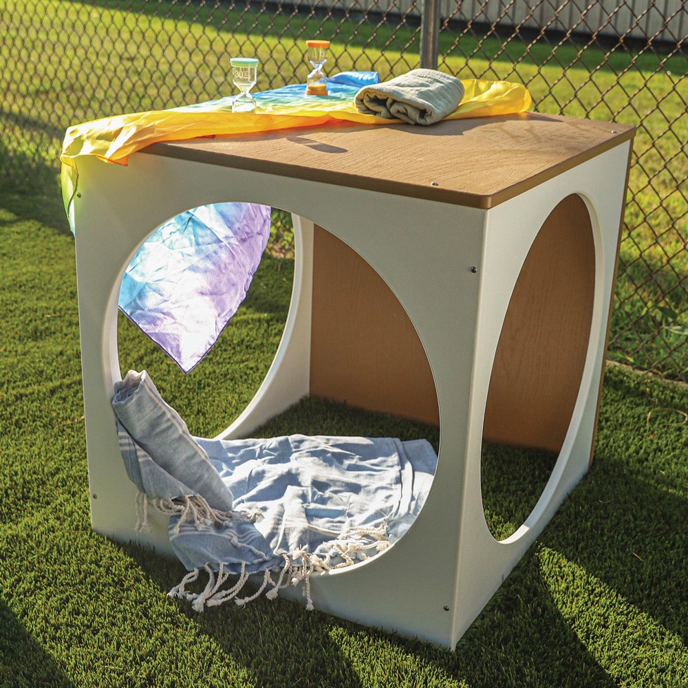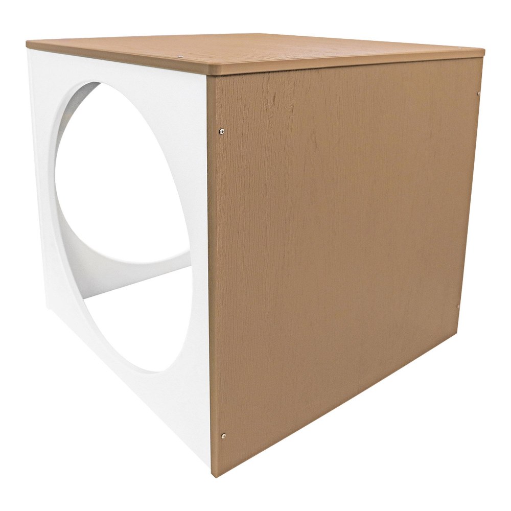 18 months & up. This outdoor version of a classroom classic ships ready to assemble and offers a cozy retreat for preschoolers. Featuring three large circular openings, the cube is spacious enough for one or two children to enjoy quiet reading, reflection, or relaxation while maintaining full visibility inside. Crafted from 3/4" textured woodgrain maple and polar white HDPE panels, it showcases crisp lines, modern accents, and coordinates seamlessly with all OutdoorED™ Collection pieces. Rust-resistant stainless steel hardware and UV-stabilized HDPE resist fading, stains, mold, and mildew, and won't chip, splinter, swell, or absorb moisture. Easy to clean with non-abrasive household cleaners, and made with recyclable HDPE that supports a more circular economy. Made in the USA and backed by a 15-year warranty. Measures 27"W x 27"H x 27"D.