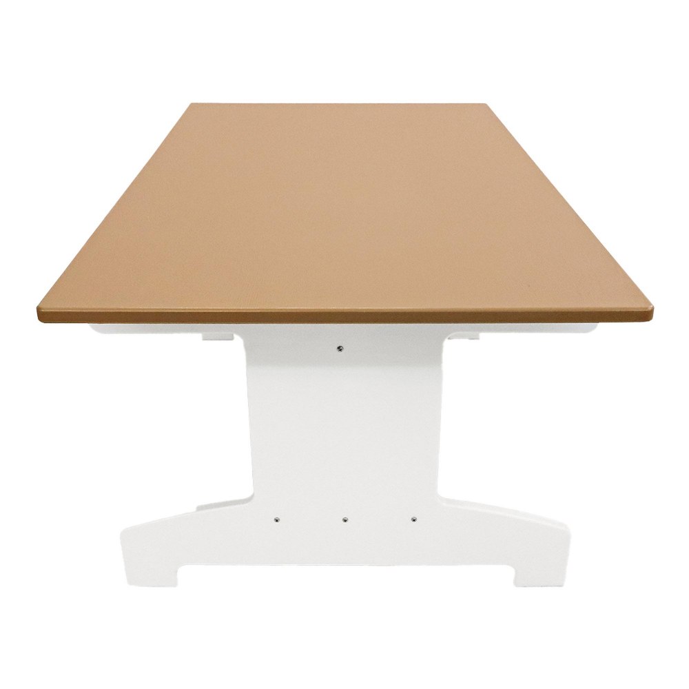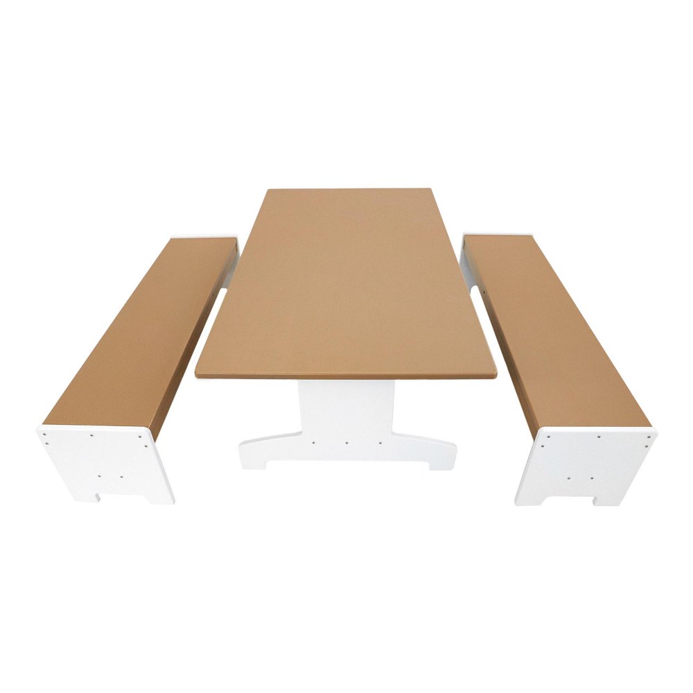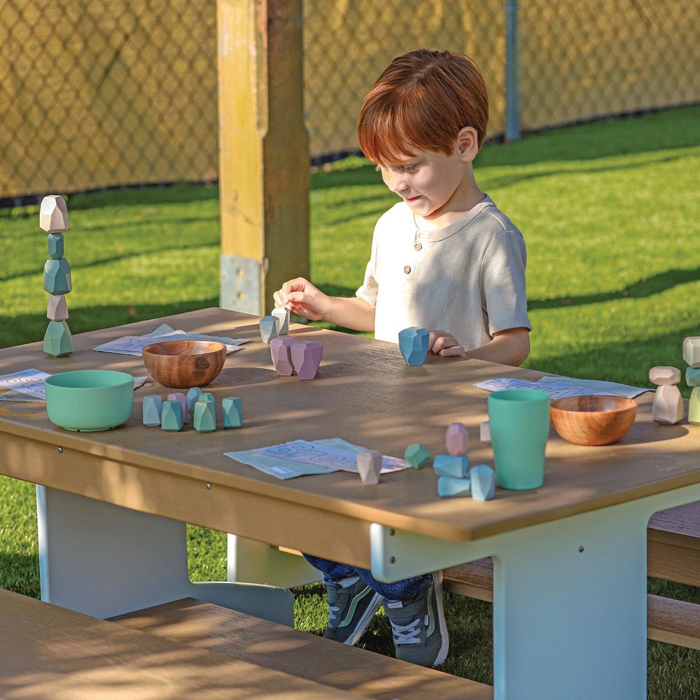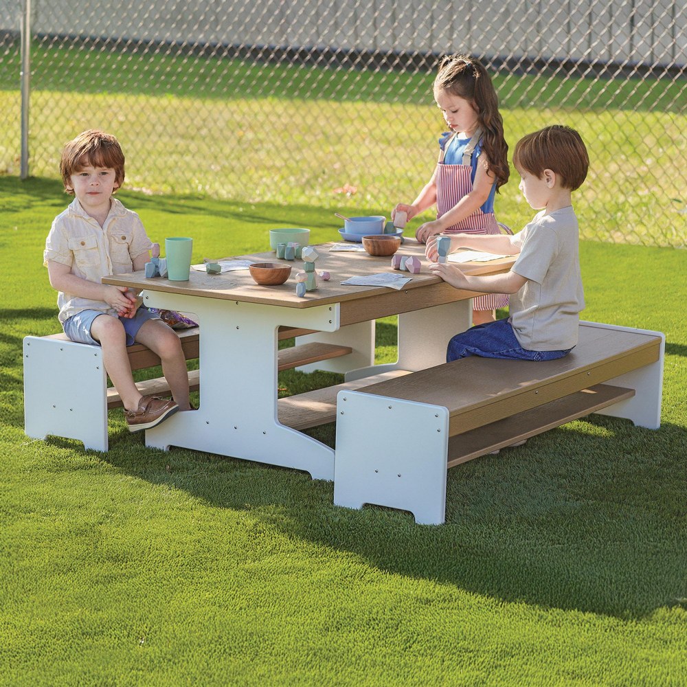3 years & up. A perfect pair, this outdoor table and two benches are designed to provide comfortable, ergonomically correct seating with plenty of clearance for children's knees and feet. Built from 3/4" textured woodgrain maple and polar white HDPE panels, each piece features crisp lines, modern accents, and coordinates seamlessly with all OutdoorED™ Collection pieces. Rust-resistant stainless steel hardware and UV-stabilized HDPE resist fading, stains, mold, and mildew, and won't chip, splinter, swell, or absorb moisture, bacteria, or odors. Easy to clean with non-abrasive household cleaners, and made with recyclable HDPE that supports a more circular economy. White panels remain cool by not absorbing or reflecting heat from the sun. Made in the USA and backed by a 15-year warranty. Measures 47.5"W x 20"H x 41"D.