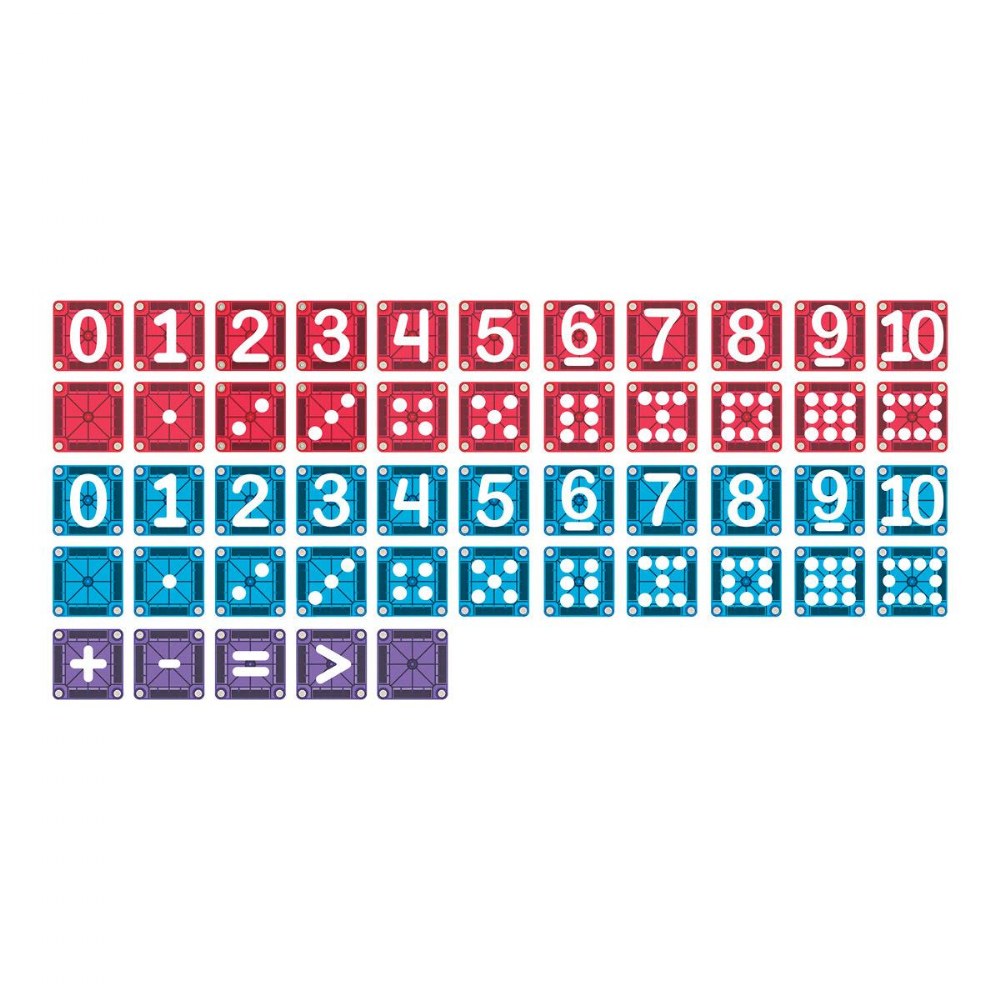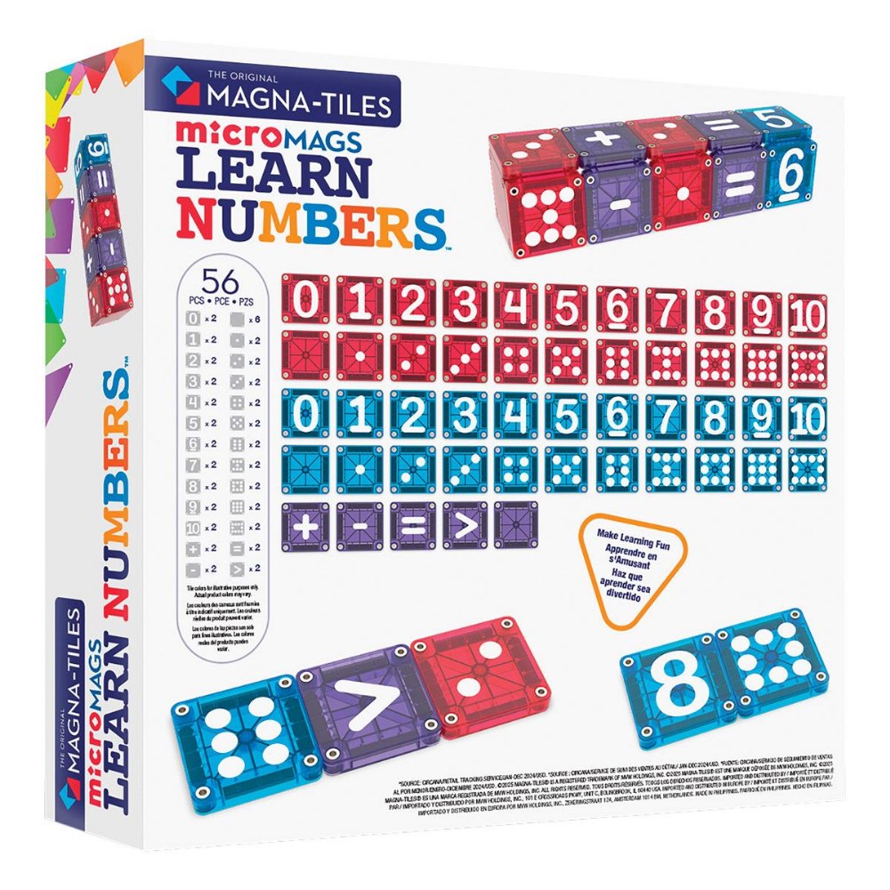 3 years & up. Bring math concepts to life with this magnetic building set designed to make numbers fun, engaging, and interactive. These microMAGS tiles measure 1.5" x 1.5" designed to make counting, comparing, and basic math feel playful. Featuring color-coded number tiles in blue and red, matching dot tiles, and purple tiles with math symbols, this set grows with your child as they advance from number recognition to simple equations.