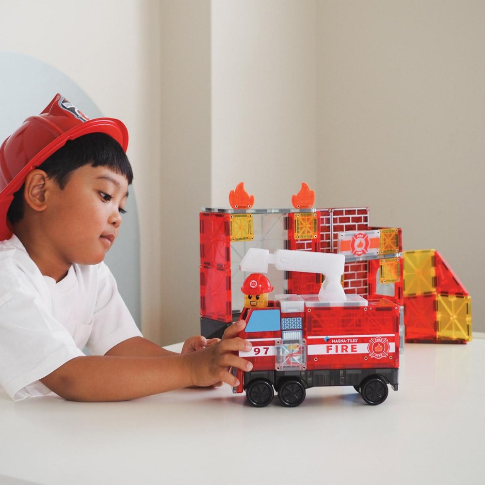 3 years & up. Step into action with the MAGNA-TILES® Fire Station Set! Build custom rescue vehicles using the modular Fire Truck, complete with an extendable ladder to reach towering blazes. Bring play to life with the Light & Sound Tile, featuring flashing lights and a real siren for an authentic firefighting adventure. The set includes a Firefighter Figure and their loyal magnetic Dalmatian, plus microMAGS Cubes, attachable Fire Tiles, ladders, and fences to create dramatic rescue scenes. Spark imagination as kids become heroes in their MAGNA-TILES® world. Pair it with the Police Station Set for even more teamwork and adventure!