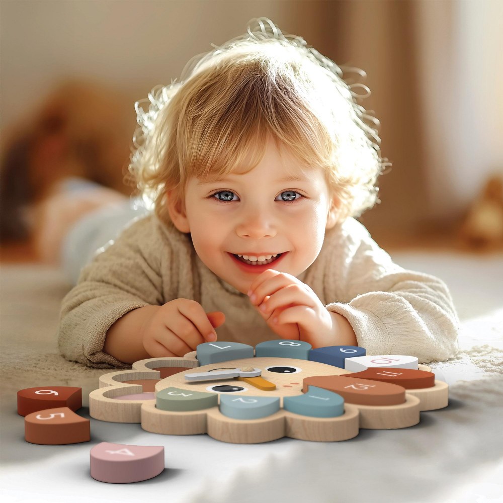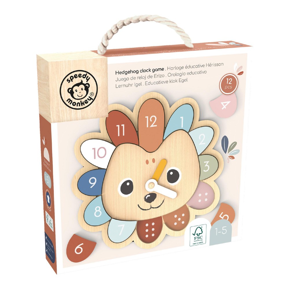 12 months & up. Make learning time fun with the Hedgehog Clock Puzzle! This charming wooden puzzle helps young children explore numbers, shapes, and the basics of telling time. Featuring an adorable hedgehog design, it includes 12 colorful, shape-matching number blocks that fit neatly into their slots. This puzzle is perfect for building fine motor skills and early cognitive development. Crafted from high-quality, FSC-certified wood and finished with child-safe, non-toxic paints, this durable, eco-friendly toy is built to last. Moveable hour and minute hands inspire imaginative play while introducing time-telling and daily routines. With its bright colors and easy-to-grasp pieces, the Hedgehog Clock Puzzle encourages hand-eye coordination, shape recognition, and early math skills through playful, hands-on learning.