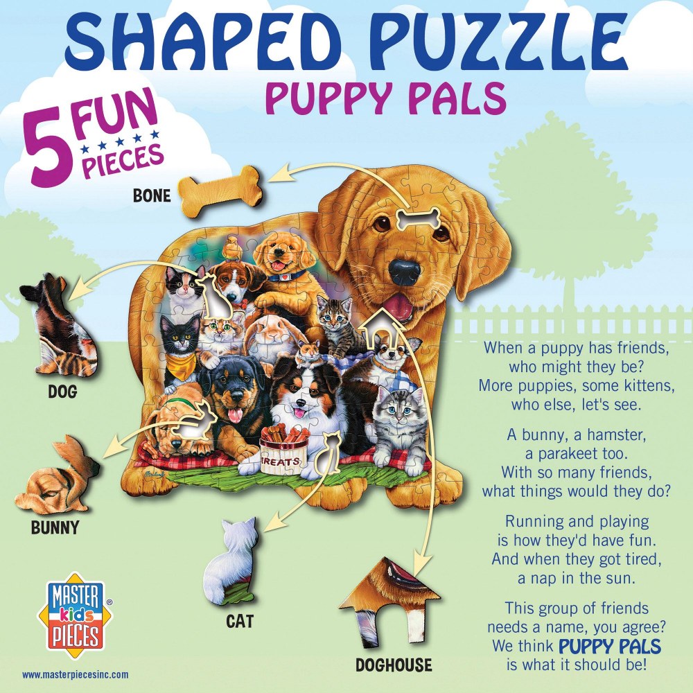 6 years & up. Bring home hours of fun and discovery with these engaging shaped puzzles! Kids can piece together the playful Puppy Pals Shaped Puzzle (17.5" x 15.5") or the adventurous Dinosaur Days Shaped Puzzle (14" x 20.5"), each featuring 100 pieces and 5 hidden shaped pieces for extra surprise. From cuddly forest friends to roaming prehistoric giants, these puzzles inspire creativity, build confidence, strengthen problem-solving skills, and provide hours of screen-free entertainment. Available individually or as a set of two for even more fun and learning!