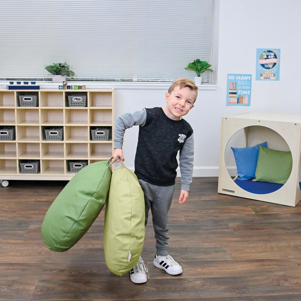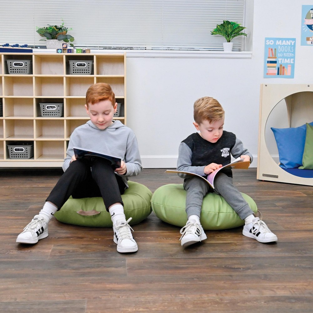 12 months & up. Create a cozy and flexible learning space with our 18" x 18" Mini Round Poufs. Made with CertiPUR-US® certified foam and durable vegan leather, these poufs provide safe, comfortable seating that's built to last. Easy-grab handles make them simple for teachers and children to move around the room, adding both style and practical versatility to any classroom or play area.