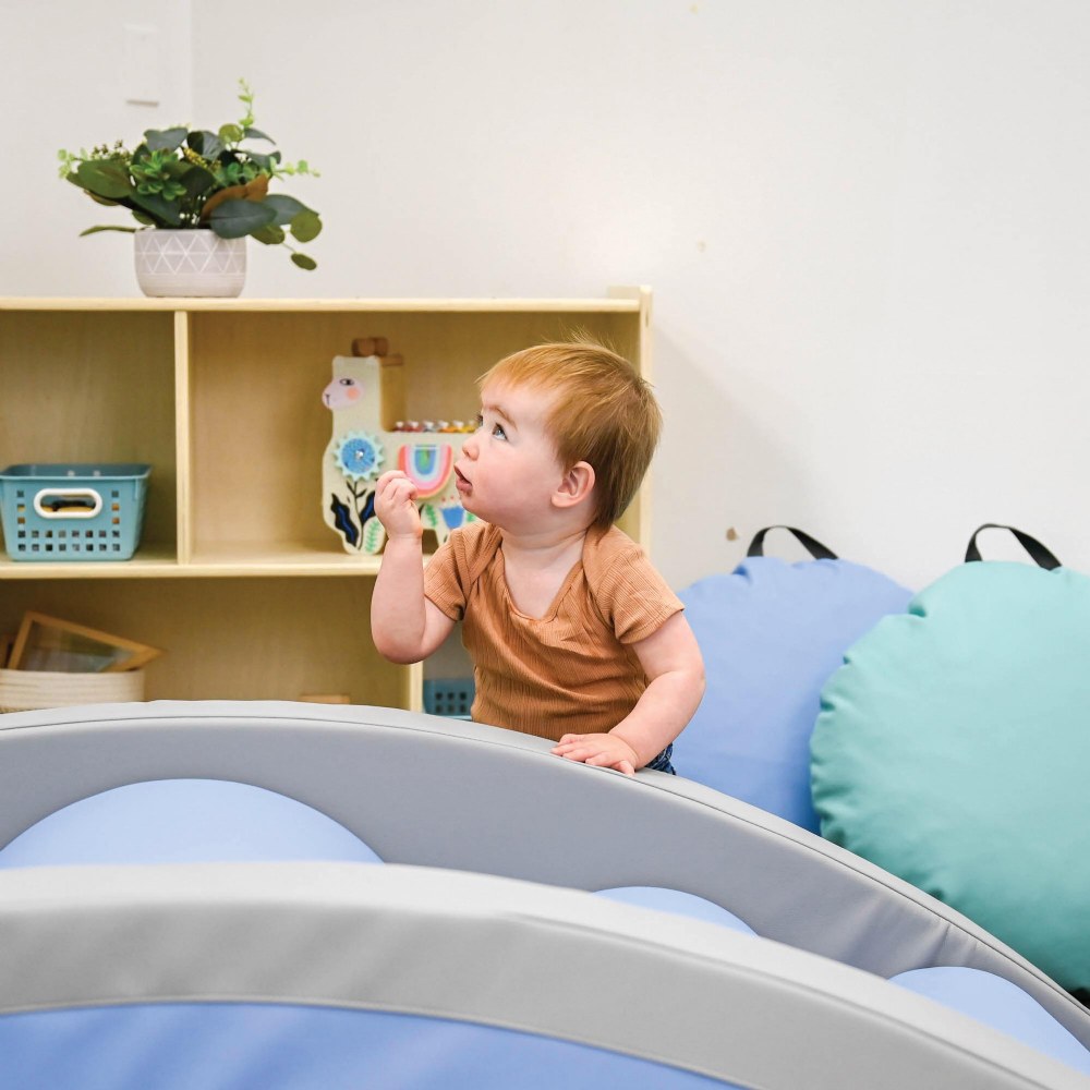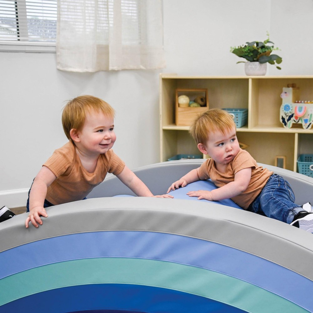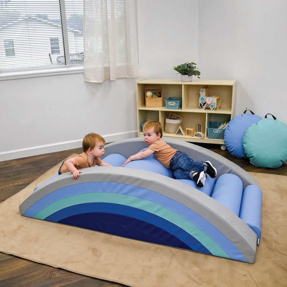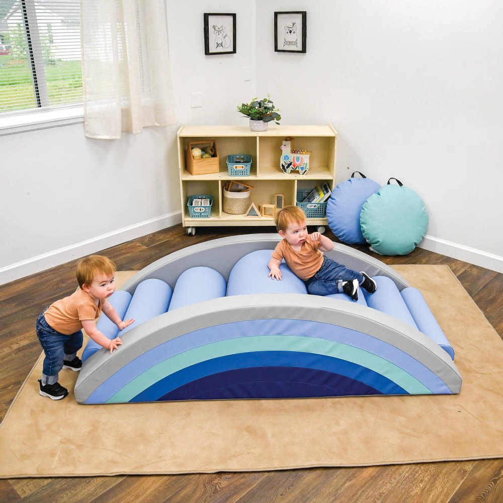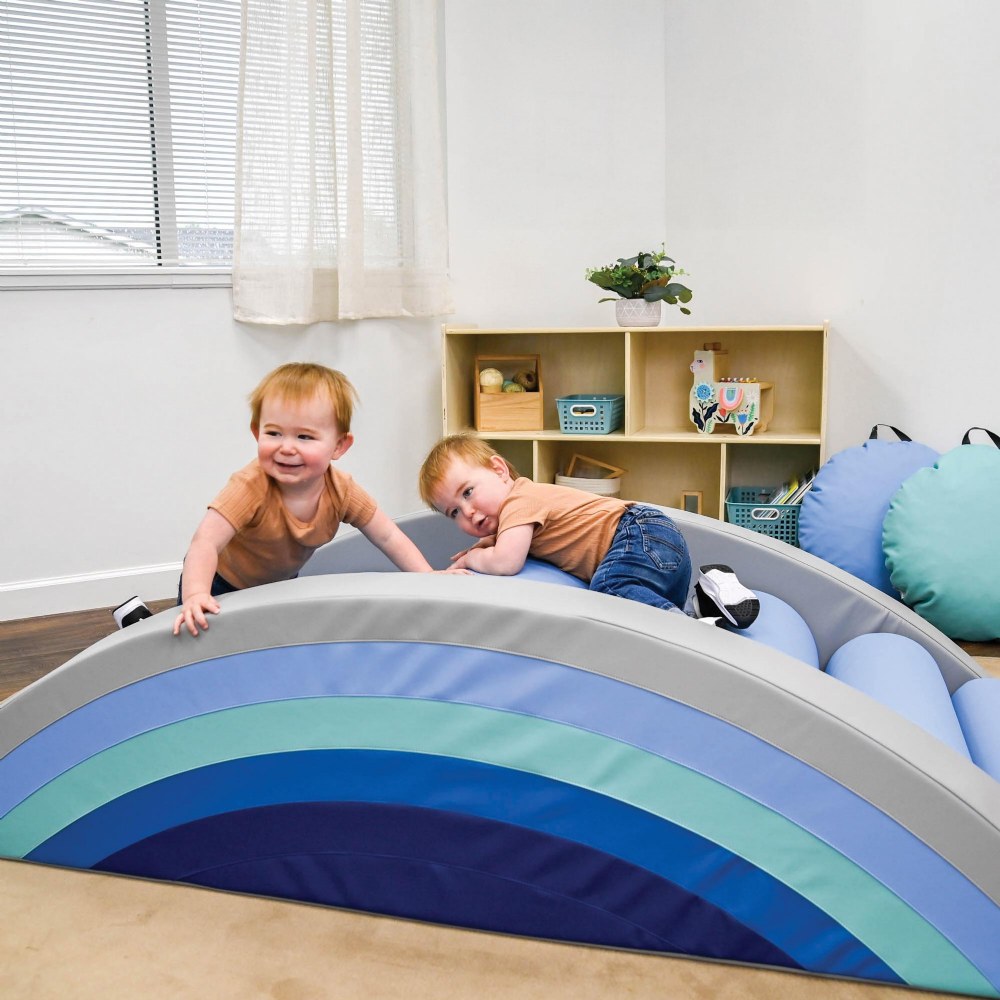 12 months & up. The Rainbow Arch Climber is a 9-piece soft play set that encourages climbing, crawling, and balancing to support coordination and gross motor development. Built with durable foam and easy-clean vegan leather, each piece connects securely with hook-and-loop fasteners for safe, stable play. Ideal for classrooms and indoor play spaces. This set is made in the USA, and includes a 2-year warranty for lasting quality. Assembled set measures 71"L x 40"W x 18"H.