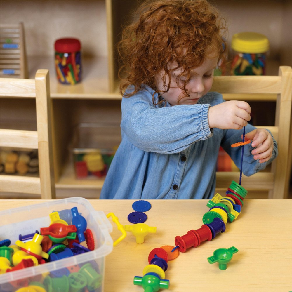 3 years & up. Stack, sort, lace, and more - the possibilities are endless! Colorful, plastic buttons and spools in 6 different colors feature large holes for lacing and stack for counting and sorting. Includes 16 28" laces and 12 stoppers to use at the end of the laces. Great for early math skills, color recognition, and fine motor development.