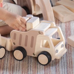 2 years & up. This durable plywood truck is a great addition to any classroom, playroom or block play area. Large birch plywood vehicle features natural-toned, screened artwork and soft plastic, non-skid wheels. Easily incorporate this durable truck into any block play area for enhanced dramatic play and builds. Ships fully assembled. Truck measures 7"L x 9.5"W x 6"H.