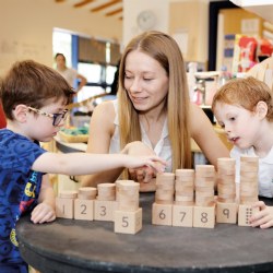 18 months & up. The 1 - 10 Stackers will help children learn early number concepts and are ideal to support early number sense and counting. The stacker bases measure 2" and show four different representations for each number: numeral, standard 1-5 dice array, random dot array, and 10-frame pattern. Made from responsibly sourced beechwood, each set includes ten number posts (2.5"-7") and 55 rings.