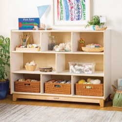 3 years and up. Constructed from a durable, easy-to-clean combination of birch plywood, white laminate plywood and birch solids, this spacious storage unit features three wide shelves conveniently divided into eight compartments. A finished back panel and toe-kick panel prevents objects, toys, learning materials and books from being lost beneath or behind the shelf, Clean with mild soap and water. Do not use cleansers, bleach, etc. Measures 48"W x 36"H x 15"D. Ships fully assembled. Limited Lifetime Warranty.