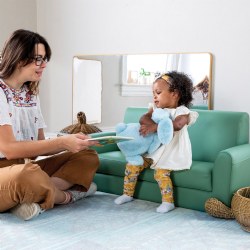 6 months & up. Reflections are fascinating to young children. Incorporate a variety of mirrors into the classroom to entice children to explore and develop self-awareness, intellectual curiosity and cognitive skills as they discover themselves and the world around them. Easily mount this large, durable mirror to the classroom wall. Measures 48"W x 24"H.