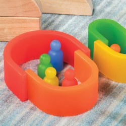 2 years & up. Bring life to any block play community with the vibrant Discovery People - Rainbow. With bright rainbow hues, these simplified people shapes will enhance dramatic play opportunities during traditional block play and seamlessly complement the rest of the Discovery collection during light and sensory exploration. Each set includes 16 solid figures: 8 tall figures and 8 short figures in assorted colors. Taller figures measure 1.3"W x 2.8"H.