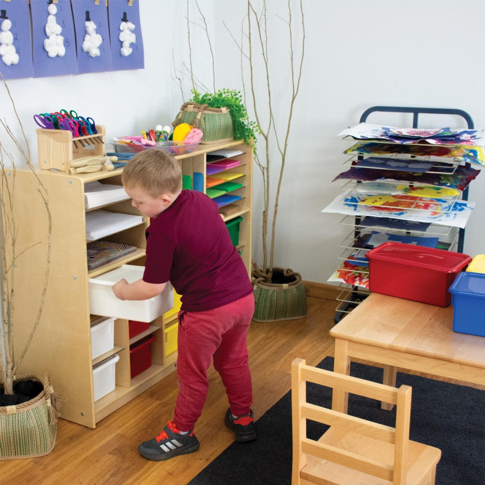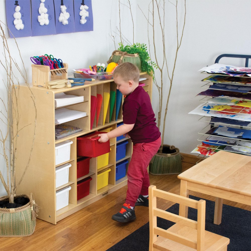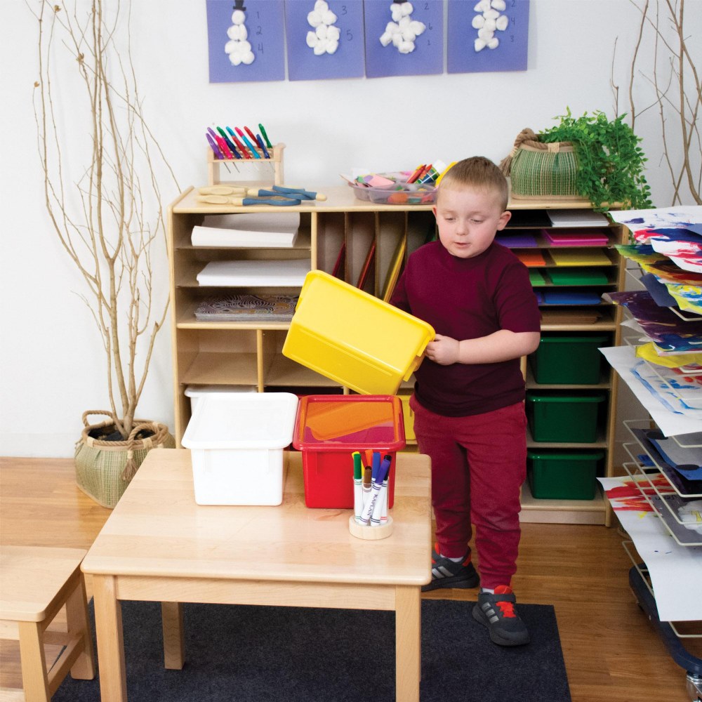 Precision-molded storage bin and lid constructed from quality colored polypropylene will help maintain an organized and efficient learning environment. These storage bins can be incredibly versatile and useful in a classroom, home, office or anywhere you want organization. You can use a bin for supplies, learning center activities, craft projects and more. Create a nature bin with rocks, leaves and magnifying glass or a construction bin with building blocks and tools for imaginative play. Set of 5 storage bins. Bins measure 5.25"H x 12.25"W x 8"D.