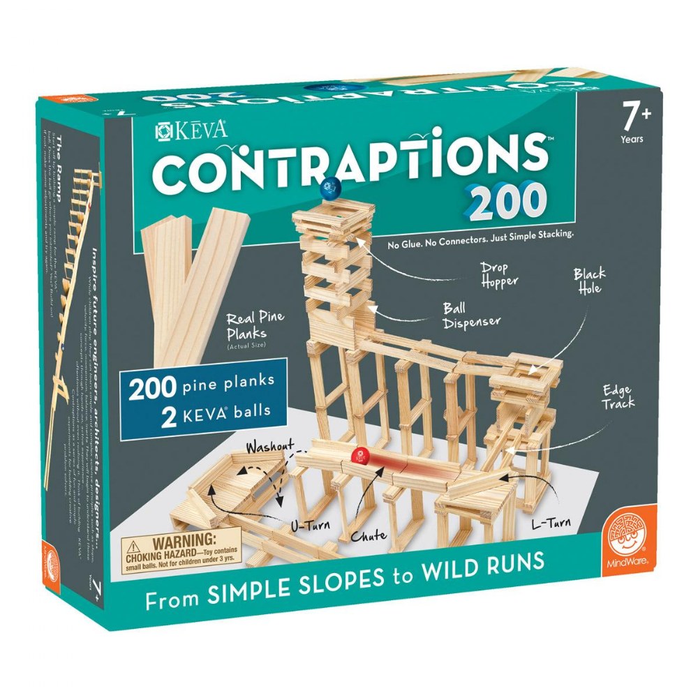 7 years & up. Construct tracks of tunnels, funnels, ramps, and chutes, then set the ball rolling and watch your creation come to life. The open-ended, no rules play promotes experimentation, creativity, and problem solving, which are key mental skills for aspiring young engineers and architects. As children build through trial and error, they gain an early understanding of physics and engineering concepts like balance and structural stability. No glue and no connectors means structures are vulnerable to collapse, but this teaches children to build with care, honoring fine motor skills and dexterity in the process. Set includes: 200 pine planks, 2 KEVA® balls, and an idea booklet.