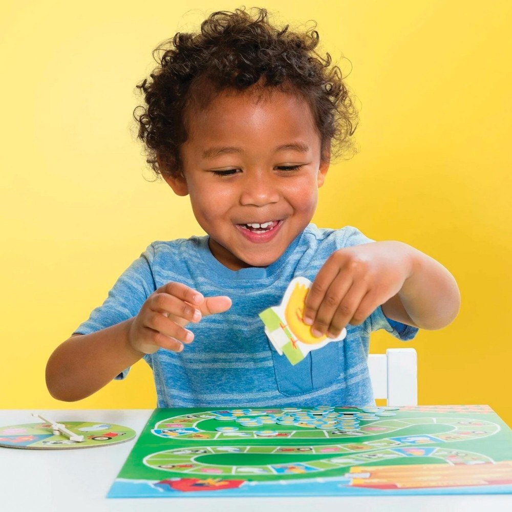 3 years & up. The baby chicks have flown the coop®! All players work together to help Mother Hen collect her chicks and bring them back to the coop® before Mother Hen gets to the last space on the board. With cooperative games, the stress of losing goes away because players are playing as a team against a common obstacle and not against each other. Count Your Chicken eliminates stress, empowers young learners, and teaches kids that playing together can be fun!