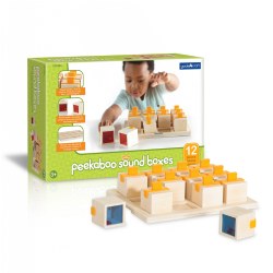 3 years & up. Let's make some noise with these fun sound shakers! These sturdy wooden boxes are easy to grip. Have children shake the wooden cubes to hear each unique sound and find its match. To self-correct, simply look through the provided translucent-colored, acrylic base. These Peekaboo Soundboxes develop matching, concentration, fine motor, sensory, problem solving, and cognitive skills. The set includes 12 soundboxes with six unique sounds and a storage base.